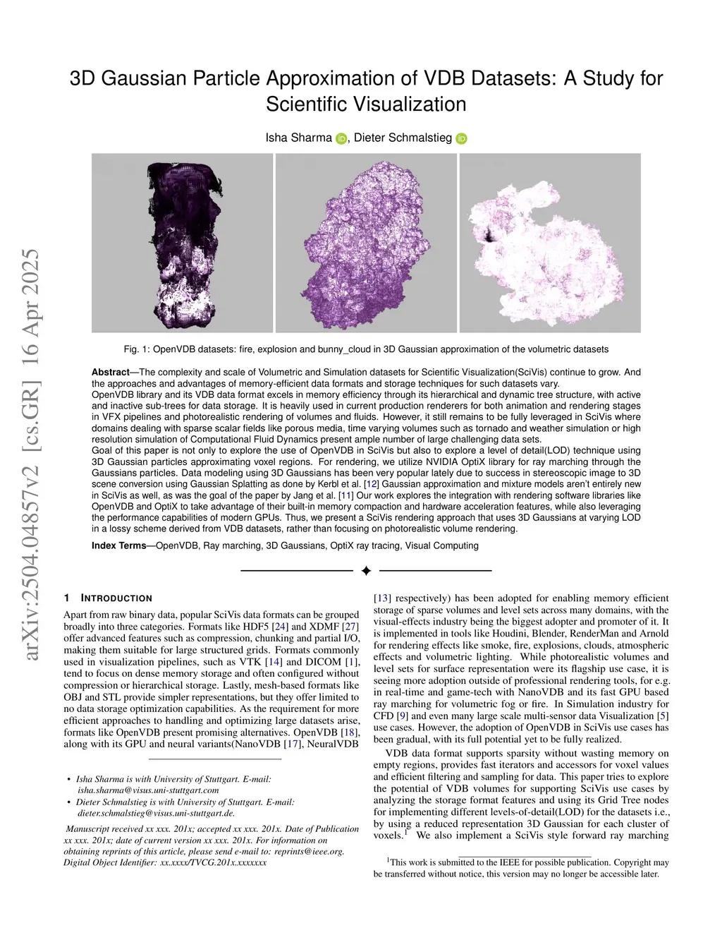 The complexity and scale of Volumetric and Simulation datasets for Scientific Visualization(SciVis) continue to grow. And the approaches and advantages of memory-efficient data formats and storage techniques for such datasets vary. OpenVDB library and its VDB data format excels in memory efficiency through its hierarchical and dynamic tree structure, with active and inactive sub-trees for data storage. It is heavily used in current production renderers for both animation and rendering stages in VFX pipelines and photorealistic rendering of volumes and fluids. However, it still remains to be fully leveraged in SciVis where domains dealing with sparse scalar fields like porous media, time varying volumes such as tornado and weather simulation or high resolution simulation of Computational Fluid Dynamics present ample number of large challenging data sets. The goal of this paper hence is not only to explore the use of OpenVDB in SciVis but also to explore a level of detail(LOD) technique using 3D Gaussian particles approximating voxel regions. For rendering, we utilize NVIDIA OptiX library for ray marching through the Gaussians particles. Data modeling using 3D Gaussians has been very popular lately due to success in stereoscopic image to 3D scene conversion using Gaussian Splatting and Gaussian approximation and mixture models aren't entirely new in SciVis as well. Our work explores the integration with rendering software libraries like OpenVDB and OptiX to take advantage of their built-in memory compaction and hardware acceleration features, while also leveraging the performance capabilities of modern GPUs. Thus, we present a SciVis rendering approach that uses 3D Gaussians at varying LOD in a lossy scheme derived from VDB datasets, rather than focusing on photorealistic volume rendering.