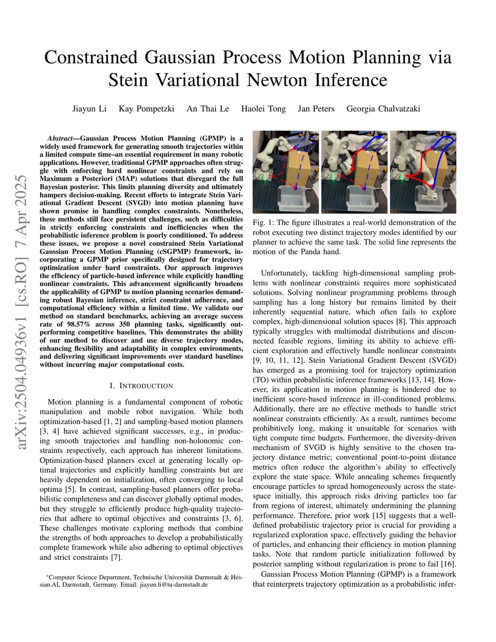 Gaussian Process Motion Planning (GPMP) is a widely used framework for generating smooth trajectories within a limited compute time--an essential requirement in many robotic applications. However, traditional GPMP approaches often struggle with enforcing hard nonlinear constraints and rely on Maximum a Posteriori (MAP) solutions that disregard the full Bayesian posterior. This limits planning diversity and ultimately hampers decision-making. Recent efforts to integrate Stein Variational Gradient Descent (SVGD) into motion planning have shown promise in handling complex constraints. Nonetheless, these methods still face persistent challenges, such as difficulties in strictly enforcing constraints and inefficiencies when the probabilistic inference problem is poorly conditioned. To address these issues, we propose a novel constrained Stein Variational Gaussian Process Motion Planning (cSGPMP) framework, incorporating a GPMP prior specifically designed for trajectory optimization under hard constraints. Our approach improves the efficiency of particle-based inference while explicitly handling nonlinear constraints. This advancement significantly broadens the applicability of GPMP to motion planning scenarios demanding robust Bayesian inference, strict constraint adherence, and computational efficiency within a limited time. We validate our method on standard benchmarks, achieving an average success rate of 98.57% across 350 planning tasks, significantly outperforming competitive baselines. This demonstrates the ability of our method to discover and use diverse trajectory modes, enhancing flexibility and adaptability in complex environments, and delivering significant improvements over standard baselines without incurring major computational costs.