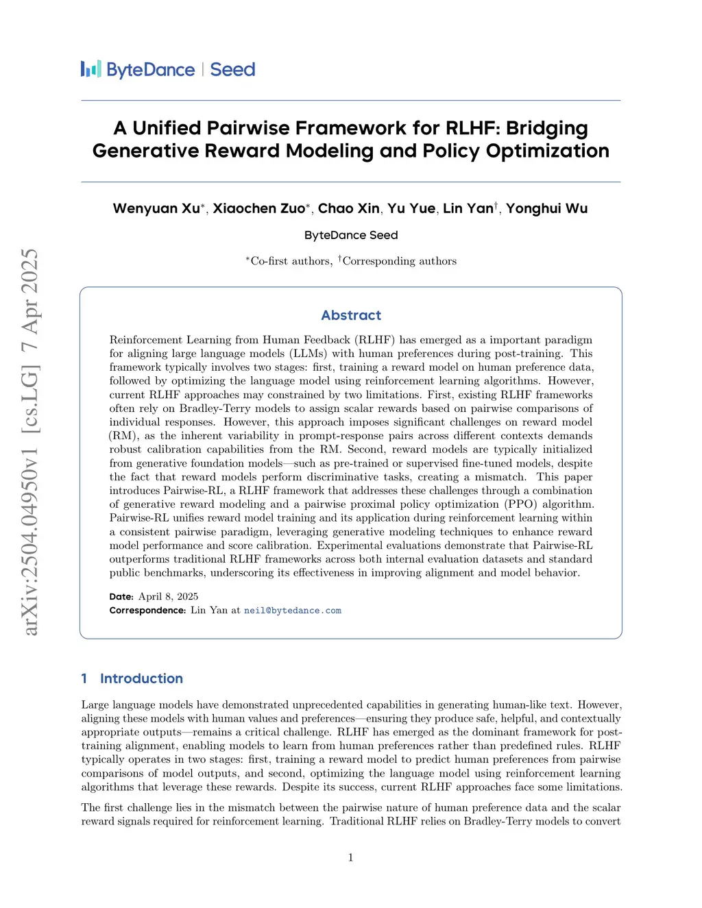 Reinforcement Learning from Human Feedback (RLHF) has emerged as a important paradigm for aligning large language models (LLMs) with human preferences during post-training. This framework typically involves two stages: first, training a reward model on human preference data, followed by optimizing the language model using reinforcement learning algorithms. However, current RLHF approaches may constrained by two limitations. First, existing RLHF frameworks often rely on Bradley-Terry models to assign scalar rewards based on pairwise comparisons of individual responses. However, this approach imposes significant challenges on reward model (RM), as the inherent variability in prompt-response pairs across different contexts demands robust calibration capabilities from the RM. Second, reward models are typically initialized from generative foundation models, such as pre-trained or supervised fine-tuned models, despite the fact that reward models perform discriminative tasks, creating a mismatch. This paper introduces Pairwise-RL, a RLHF framework that addresses these challenges through a combination of generative reward modeling and a pairwise proximal policy optimization (PPO) algorithm. Pairwise-RL unifies reward model training and its application during reinforcement learning within a consistent pairwise paradigm, leveraging generative modeling techniques to enhance reward model performance and score calibration. Experimental evaluations demonstrate that Pairwise-RL outperforms traditional RLHF frameworks across both internal evaluation datasets and standard public benchmarks, underscoring its effectiveness in improving alignment and model behavior.
