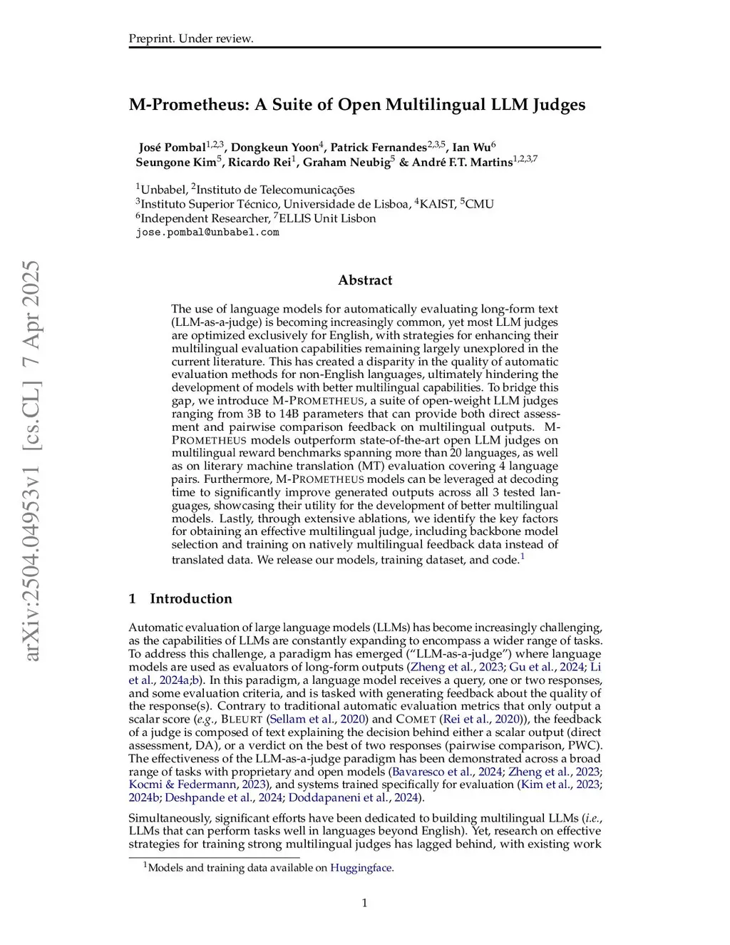 The use of language models for automatically evaluating long-form text (LLM-as-a-judge) is becoming increasingly common, yet most LLM judges are optimized exclusively for English, with strategies for enhancing their multilingual evaluation capabilities remaining largely unexplored in the current literature. This has created a disparity in the quality of automatic evaluation methods for non-English languages, ultimately hindering the development of models with better multilingual capabilities. To bridge this gap, we introduce M-Prometheus, a suite of open-weight LLM judges ranging from 3B to 14B parameters that can provide both direct assessment and pairwise comparison feedback on multilingual outputs. M-Prometheus models outperform state-of-the-art open LLM judges on multilingual reward benchmarks spanning more than 20 languages, as well as on literary machine translation (MT) evaluation covering 4 language pairs. Furthermore, M-Prometheus models can be leveraged at decoding time to significantly improve generated outputs across all 3 tested languages, showcasing their utility for the development of better multilingual models. Lastly, through extensive ablations, we identify the key factors for obtaining an effective multilingual judge, including backbone model selection and training on synthetic multilingual feedback data instead of translated data. We release our models, training dataset, and code.