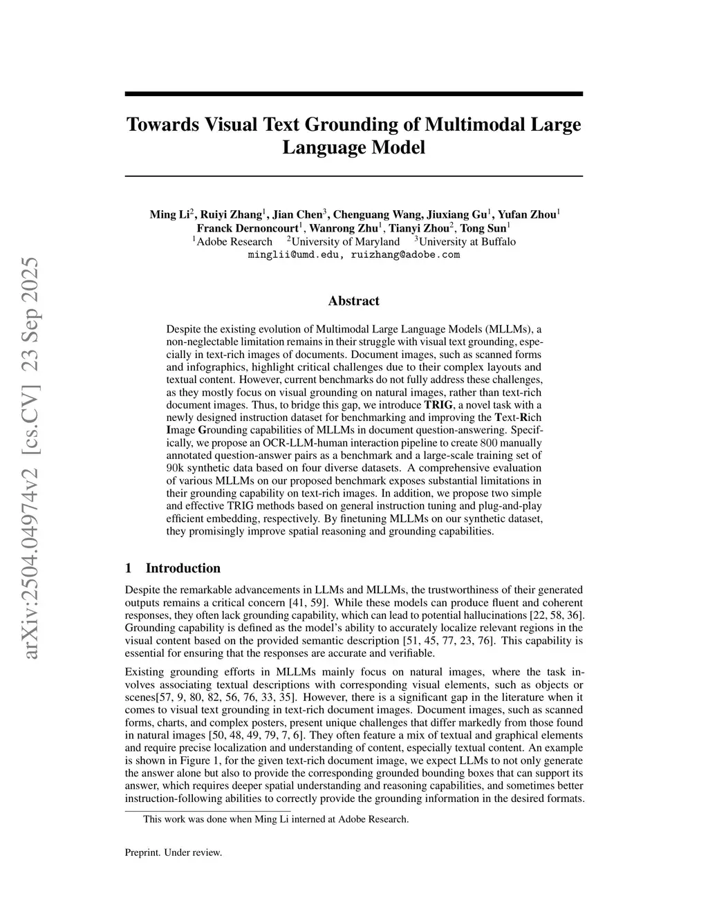 Despite the existing evolution of Multimodal Large Language Models (MLLMs), a non-neglectable limitation remains in their struggle with visual text grounding, especially in text-rich images of documents. Document images, such as scanned forms and infographics, highlight critical challenges due to their complex layouts and textual content. However, current benchmarks do not fully address these challenges, as they mostly focus on visual grounding on natural images, rather than text-rich document images. Thus, to bridge this gap, we introduce TRIG, a novel task with a newly designed instruction dataset for benchmarking and improving the Text-Rich Image Grounding capabilities of MLLMs in document question-answering. Specifically, we propose an OCR-LLM-human interaction pipeline to create 800 manually annotated question-answer pairs as a benchmark and a large-scale training set of 90$ synthetic data based on four diverse datasets. A comprehensive evaluation of various MLLMs on our proposed benchmark exposes substantial limitations in their grounding capability on text-rich images. In addition, we propose two simple and effective TRIG methods based on general instruction tuning and plug-and-play efficient embedding, respectively. By finetuning MLLMs on our synthetic dataset, they promisingly improve spatial reasoning and grounding capabilities.