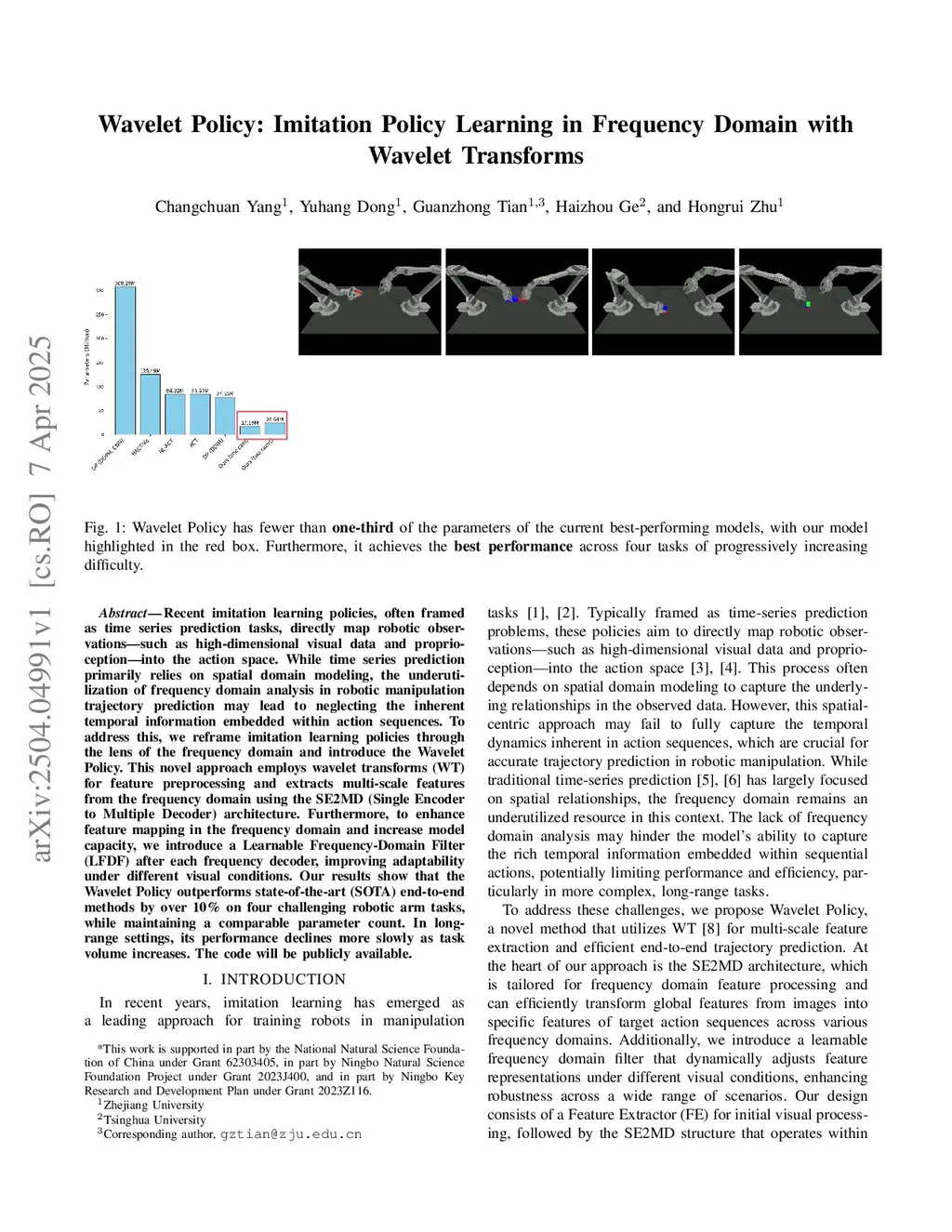 Recent imitation learning policies, often framed as time series prediction tasks, directly map robotic observations into the action space, such as high-dimensional visual data and proprioception. When deploying at the edge, we found the underutilization of frequency domain analysis in robotic manipulation trajectory prediction leads to neglecting the inherent rhythm information embedded within action sequences, resulting in errors at critical moments. To address this, we reframe imitation learning policies through the lens of time-scale domain and introduce the Wavelet Policy. This novel approach employs wavelet transforms (WT) and new Features Extractor (FE) for feature preprocessing and extracts multi-scale features using the Single Encoder to Multiple Decoder (SE2MD) architecture. Furthermore, to enhance feature mapping in the scale domain and appropriately increase model capacity, we introduce a Learnable Scale Domain Filter (LSDF) after each decoder, improving adaptability under different visual conditions. Our results show that the Wavelet Policy maintaining a comparable parameter count outperforms SOTA end-to-end methods on four challenging simulation robotic arm tasks and real tasks, especially at critical moments and remote settings simultaneously. We release the source code and model checkpoint of simulation task atthis https URL.