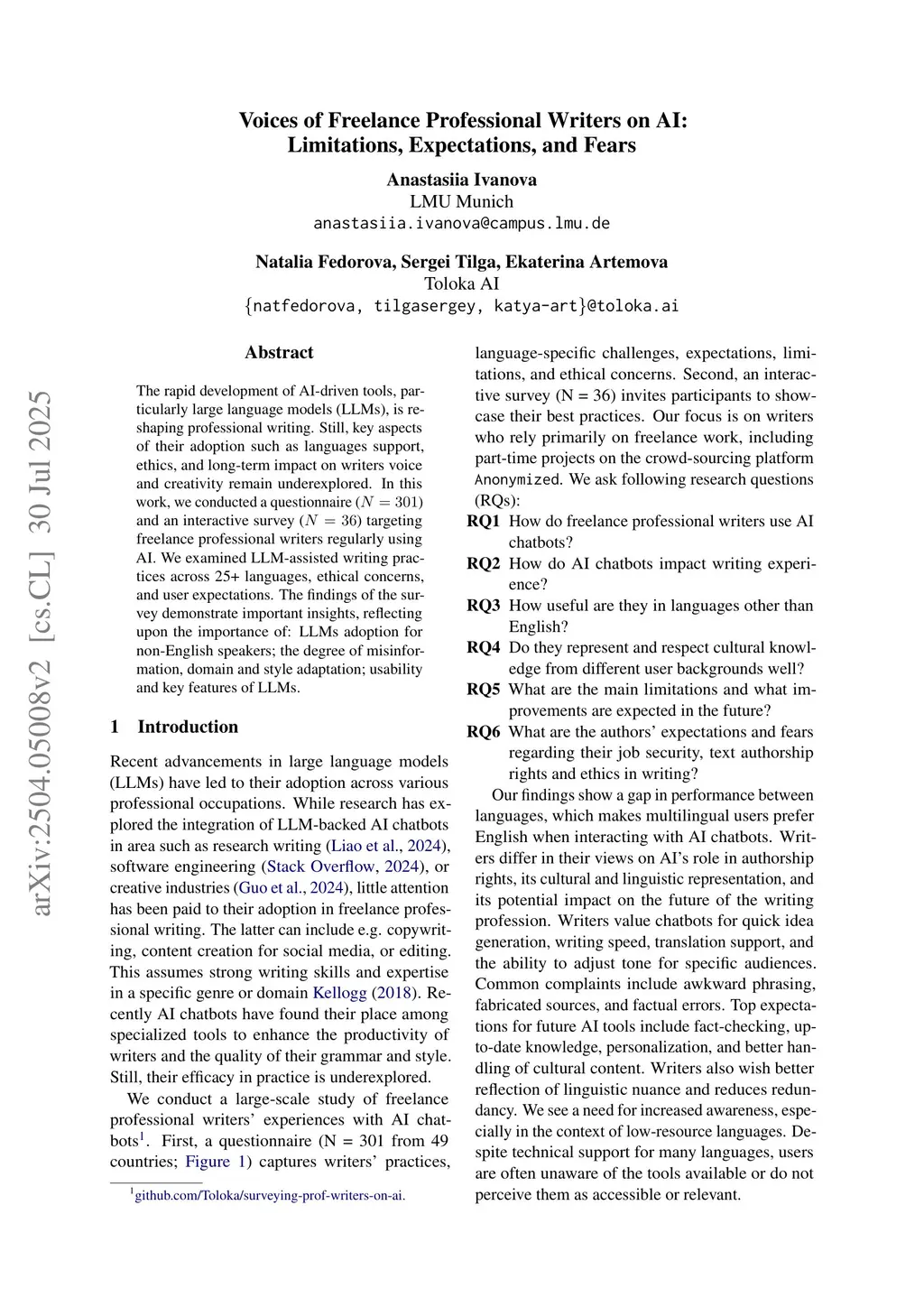 Voices of Freelance Professional Writers on AI: Limitations, Expectations, and Fears