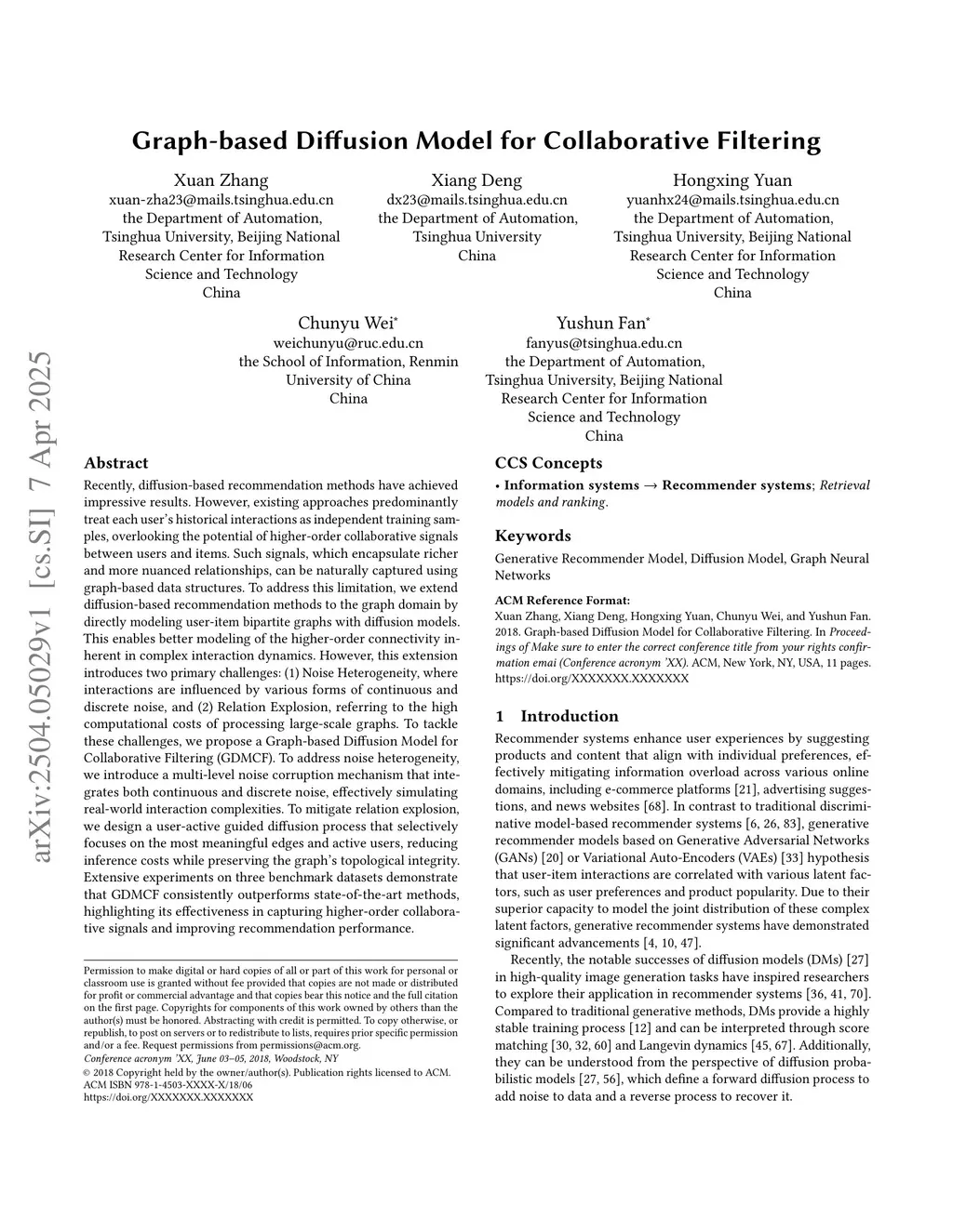 Recently, diffusion-based recommendation methods have achieved impressive results. However, existing approaches predominantly treat each user's historical interactions as independent training samples, overlooking the potential of higher-order collaborative signals between users and items. Such signals, which encapsulate richer and more nuanced relationships, can be naturally captured using graph-based data structures. To address this limitation, we extend diffusion-based recommendation methods to the graph domain by directly modeling user-item bipartite graphs with diffusion models. This enables better modeling of the higher-order connectivity inherent in complex interaction dynamics. However, this extension introduces two primary challenges: (1) Noise Heterogeneity, where interactions are influenced by various forms of continuous and discrete noise, and (2) Relation Explosion, referring to the high computational costs of processing large-scale graphs. To tackle these challenges, we propose a Graph-based Diffusion Model for Collaborative Filtering (GDMCF). To address noise heterogeneity, we introduce a multi-level noise corruption mechanism that integrates both continuous and discrete noise, effectively simulating real-world interaction complexities. To mitigate relation explosion, we design a user-active guided diffusion process that selectively focuses on the most meaningful edges and active users, reducing inference costs while preserving the graph's topological integrity. Extensive experiments on three benchmark datasets demonstrate that GDMCF consistently outperforms state-of-the-art methods, highlighting its effectiveness in capturing higher-order collaborative signals and improving recommendation performance.