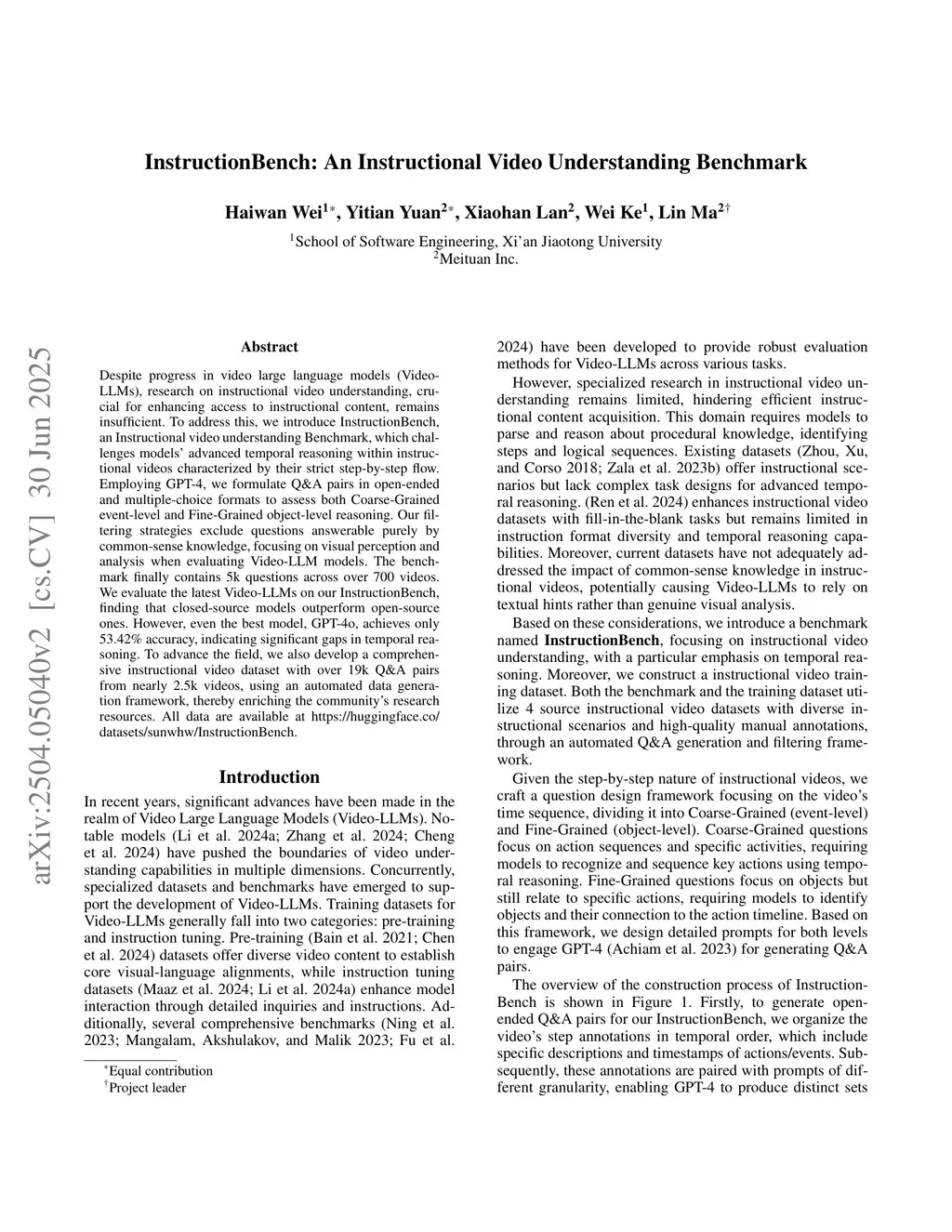 Despite progress in video large language models (Video-LLMs), research on instructional video understanding, crucial for enhancing access to instructional content, remains insufficient. To address this, we introduce InstructionBench, an Instructional video understanding Benchmark, which challenges models' advanced temporal reasoning within instructional videos characterized by their strict step-by-step flow. Employing GPT-4, we formulate Q&A pairs in open-ended and multiple-choice formats to assess both Coarse-Grained event-level and Fine-Grained object-level reasoning. Our filtering strategies exclude questions answerable purely by common-sense knowledge, focusing on visual perception and analysis when evaluating Video-LLM models. The benchmark finally contains 5k questions across over 700 videos. We evaluate the latest Video-LLMs on our InstructionBench, finding that closed-source models outperform open-source ones. However, even the best model, GPT-4o, achieves only 53.42% accuracy, indicating significant gaps in temporal reasoning. To advance the field, we also develop a comprehensive instructional video dataset with over 19k Q&A pairs from nearly 2.5k videos, using an automated data generation framework, thereby enriching the community's research resources. All data are available atthis https URL.