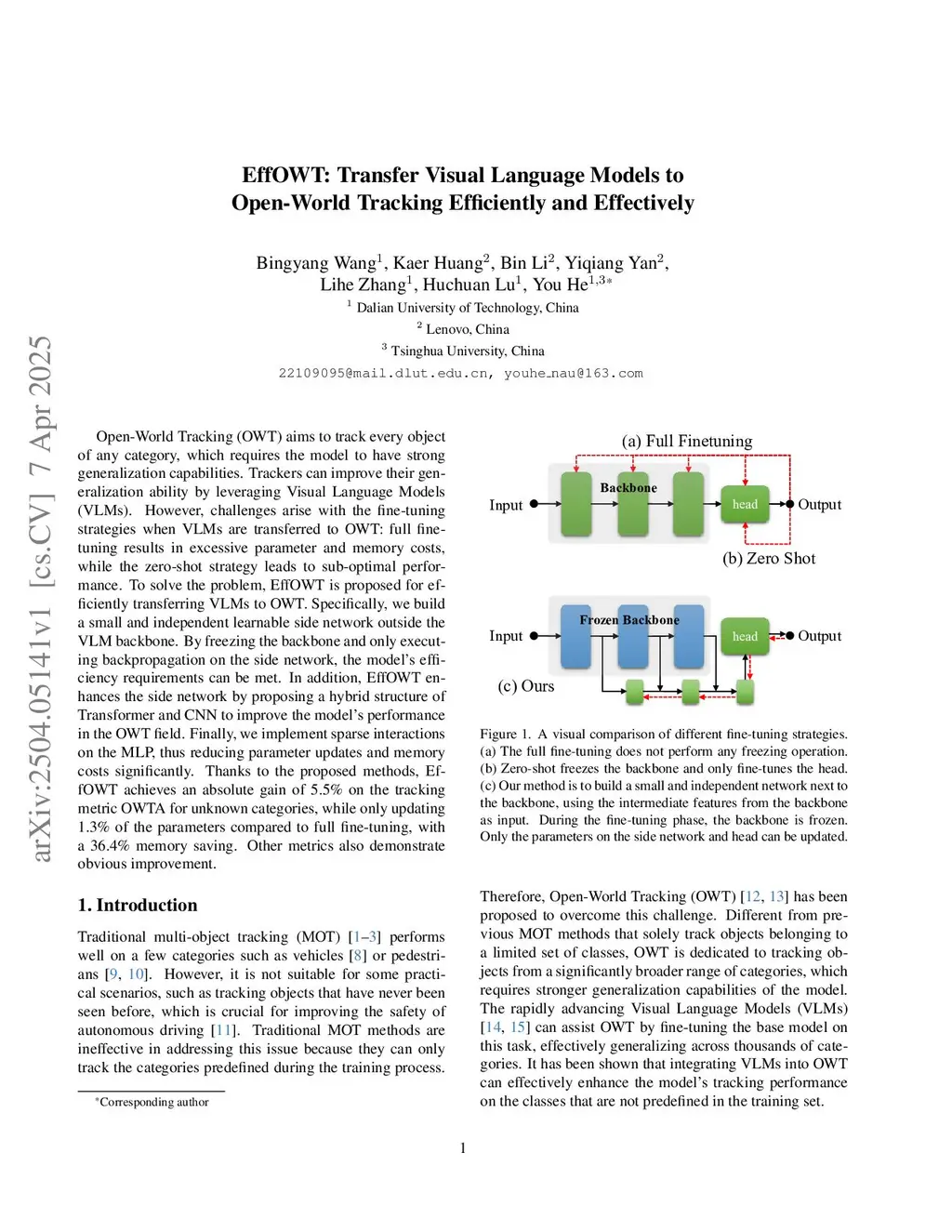Open-World Tracking (OWT) aims to track every object of any category, which requires the model to have strong generalization capabilities. Trackers can improve their generalization ability by leveraging Visual Language Models (VLMs). However, challenges arise with the fine-tuning strategies when VLMs are transferred to OWT: full fine-tuning results in excessive parameter and memory costs, while the zero-shot strategy leads to sub-optimal performance. To solve the problem, EffOWT is proposed for efficiently transferring VLMs to OWT. Specifically, we build a small and independent learnable side network outside the VLM backbone. By freezing the backbone and only executing backpropagation on the side network, the model's efficiency requirements can be met. In addition, EffOWT enhances the side network by proposing a hybrid structure of Transformer and CNN to improve the model's performance in the OWT field. Finally, we implement sparse interactions on the MLP, thus reducing parameter updates and memory costs significantly. Thanks to the proposed methods, EffOWT achieves an absolute gain of 5.5% on the tracking metric OWTA for unknown categories, while only updating 1.3% of the parameters compared to full fine-tuning, with a 36.4% memory saving. Other metrics also demonstrate obvious improvement.