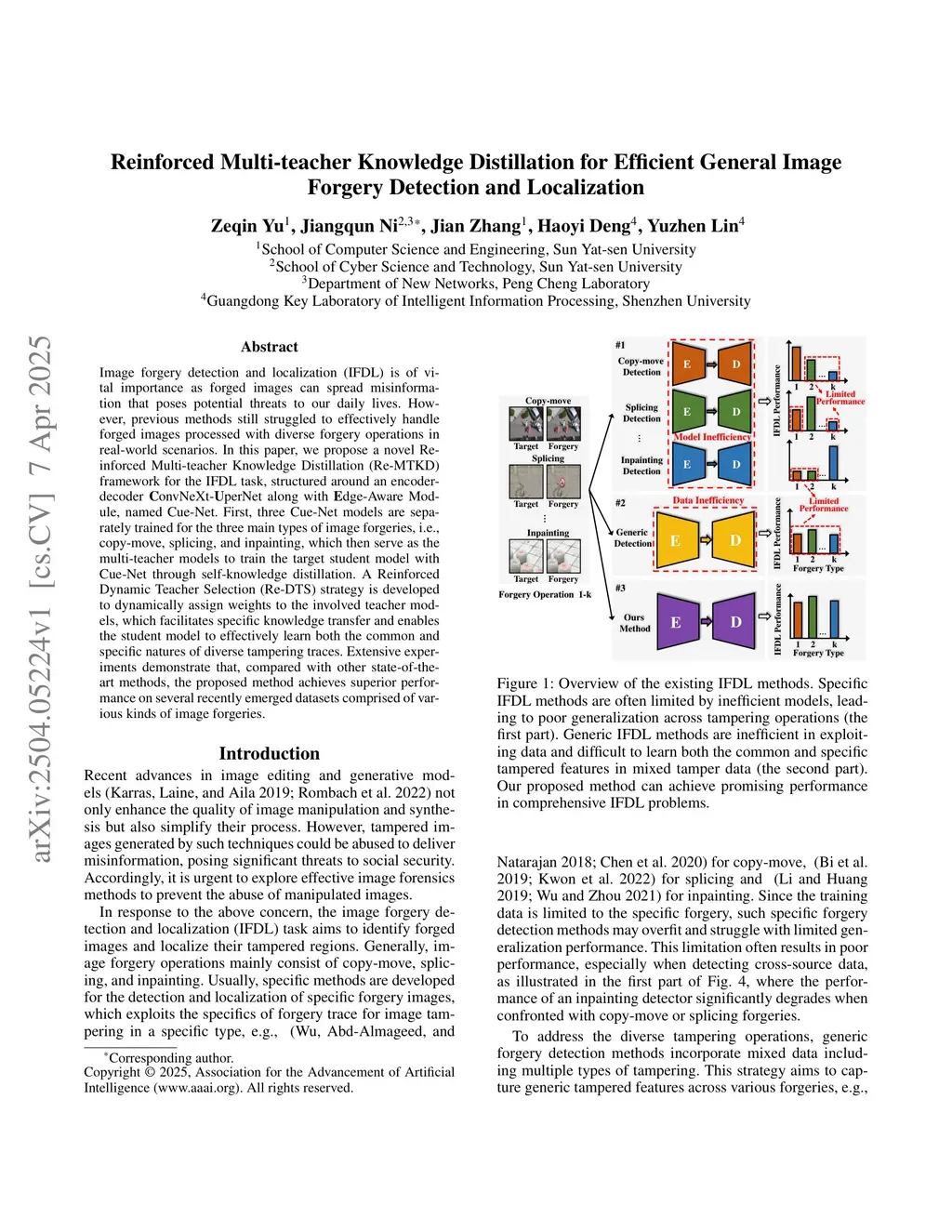 Image forgery detection and localization (IFDL) is of vital importance as forged images can spread misinformation that poses potential threats to our daily lives. However, previous methods still struggled to effectively handle forged images processed with diverse forgery operations in real-world scenarios. In this paper, we propose a novel Reinforced Multi-teacher Knowledge Distillation (Re-MTKD) framework for the IFDL task, structured around an encoder-decoder \textbf{C}onvNeXt-\textbf{U}perNet along with \textbf{E}dge-Aware Module, named Cue-Net. First, three Cue-Net models are separately trained for the three main types of image forgeries, i.e., copy-move, splicing, and inpainting, which then serve as the multi-teacher models to train the target student model with Cue-Net through self-knowledge distillation. A Reinforced Dynamic Teacher Selection (Re-DTS) strategy is developed to dynamically assign weights to the involved teacher models, which facilitates specific knowledge transfer and enables the student model to effectively learn both the common and specific natures of diverse tampering traces. Extensive experiments demonstrate that, compared with other state-of-the-art methods, the proposed method achieves superior performance on several recently emerged datasets comprised of various kinds of image forgeries.