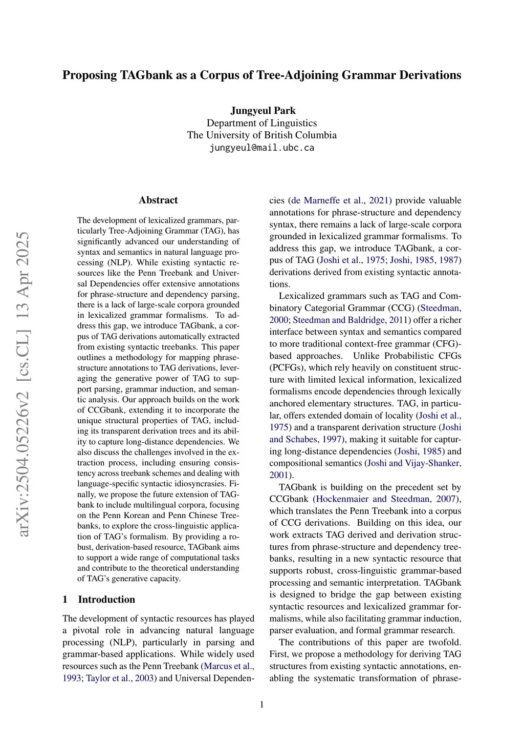 The development of lexicalized grammars, particularly Tree-Adjoining Grammar (TAG), has significantly advanced our understanding of syntax and semantics in natural language processing (NLP). While existing syntactic resources like the Penn Treebank and Universal Dependencies offer extensive annotations for phrase-structure and dependency parsing, there is a lack of large-scale corpora grounded in lexicalized grammar formalisms. To address this gap, we introduce TAGbank, a corpus of TAG derivations automatically extracted from existing syntactic treebanks. This paper outlines a methodology for mapping phrase-structure annotations to TAG derivations, leveraging the generative power of TAG to support parsing, grammar induction, and semantic analysis. Our approach builds on the work of CCGbank, extending it to incorporate the unique structural properties of TAG, including its transparent derivation trees and its ability to capture long-distance dependencies. We also discuss the challenges involved in the extraction process, including ensuring consistency across treebank schemes and dealing with language-specific syntactic idiosyncrasies. Finally, we propose the future extension of TAGbank to include multilingual corpora, focusing on the Penn Korean and Penn Chinese Treebanks, to explore the cross-linguistic application of TAG's formalism. By providing a robust, derivation-based resource, TAGbank aims to support a wide range of computational tasks and contribute to the theoretical understanding of TAG's generative capacity.