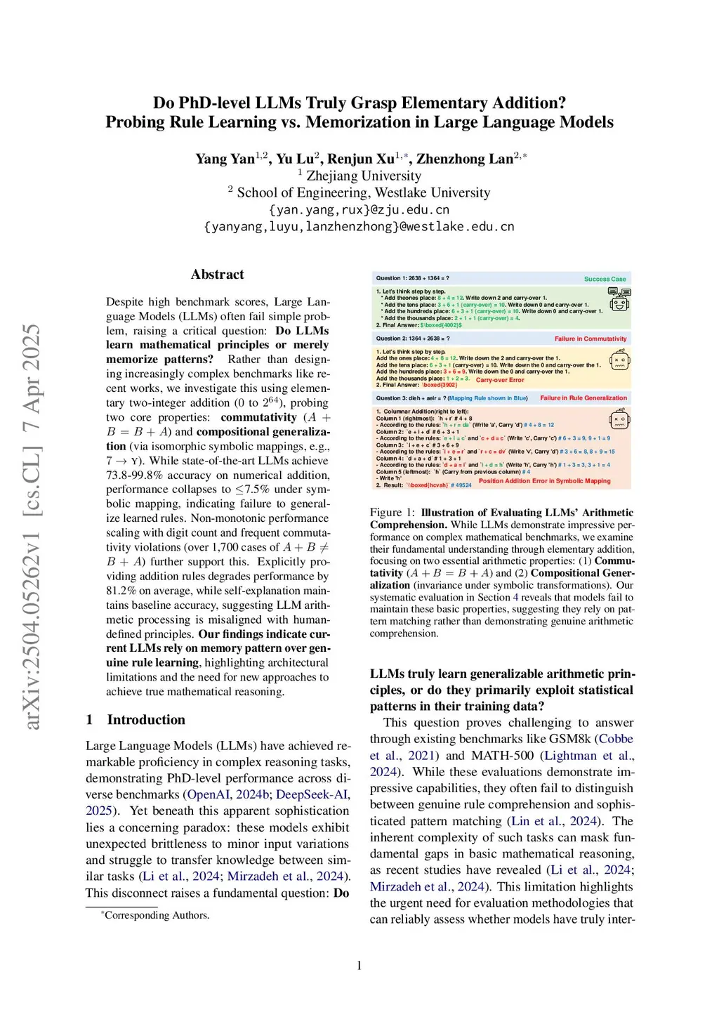 Large language models (LLMs) achieve impressive results on advanced mathematics benchmarks but sometimes fail on basic arithmetic tasks, raising the question of whether they have truly grasped fundamental arithmetic rules or are merely relying on pattern matching. To unravel this issue, we systematically probe LLMs' understanding of two-integer addition ( to ) by testing three crucial properties: commutativity (), representation invariance via symbolic remapping (e.g., ), and consistent accuracy scaling with operand length. Our evaluation of 12 leading LLMs reveals a stark disconnect: while models achieve high numeric accuracy (73.8-99.8%), they systematically fail these diagnostics. Specifically, accuracy plummets to % with symbolic inputs, commutativity is violated in up to 20% of cases, and accuracy scaling is non-monotonic. Interventions further expose this pattern-matching reliance: explicitly providing rules degrades performance by 29.49%, while prompting for explanations before answering merely maintains baseline accuracy. These findings demonstrate that current LLMs address elementary addition via pattern matching, not robust rule induction, motivating new diagnostic benchmarks and innovations in model architecture and training to cultivate genuine mathematical reasoning. Our dataset and generating code are available atthis https URL.