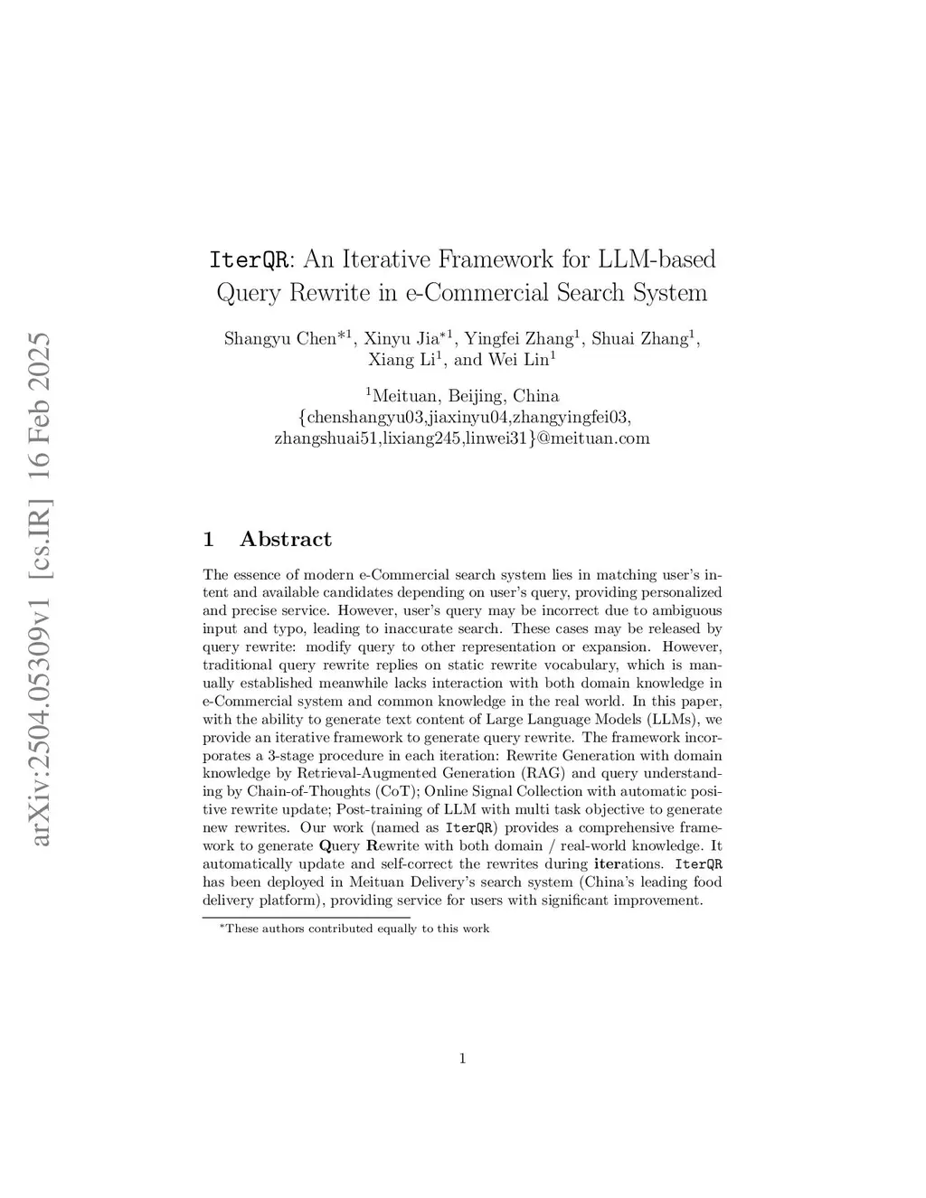 The essence of modern e-Commercial search system lies in matching user's intent and available candidates depending on user's query, providing personalized and precise service. However, user's query may be incorrect due to ambiguous input and typo, leading to inaccurate search. These cases may be released by query rewrite: modify query to other representation or expansion. However, traditional query rewrite replies on static rewrite vocabulary, which is manually established meanwhile lacks interaction with both domain knowledge in e-Commercial system and common knowledge in the real world. In this paper, with the ability to generate text content of Large Language Models (LLMs), we provide an iterative framework to generate query rewrite. The framework incorporates a 3-stage procedure in each iteration: Rewrite Generation with domain knowledge by Retrieval-Augmented Generation (RAG) and query understanding by Chain-of-Thoughts (CoT); Online Signal Collection with automatic positive rewrite update; Post-training of LLM with multi task objective to generate new rewrites. Our work (named as IterQR) provides a comprehensive framework to generate \textbf{Q}uery \textbf{R}ewrite with both domain / real-world knowledge. It automatically update and self-correct the rewrites during \textbf{iter}ations. \method{} has been deployed in Meituan Delivery's search system (China's leading food delivery platform), providing service for users with significant improvement.
