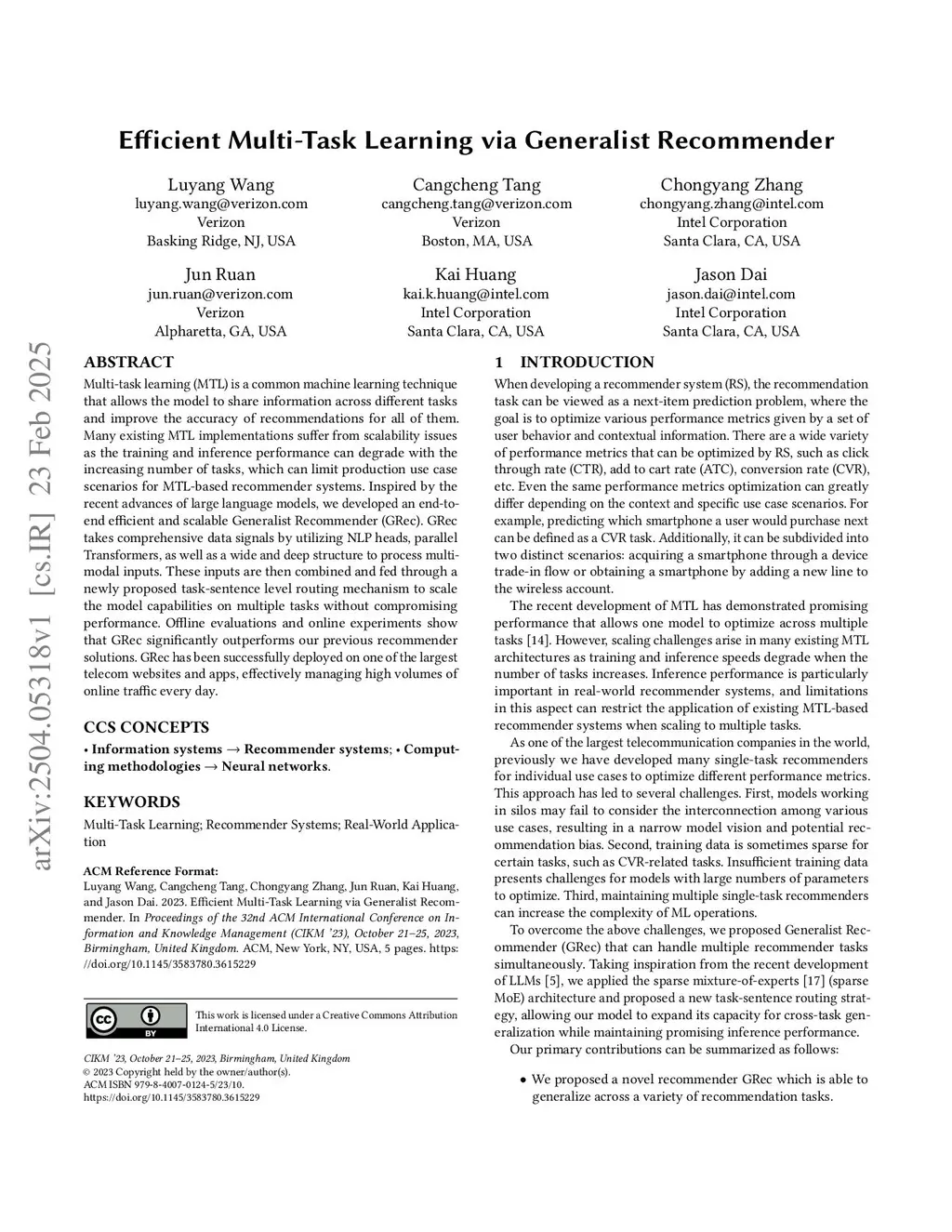 Multi-task learning (MTL) is a common machine learning technique that allows the model to share information across different tasks and improve the accuracy of recommendations for all of them. Many existing MTL implementations suffer from scalability issues as the training and inference performance can degrade with the increasing number of tasks, which can limit production use case scenarios for MTL-based recommender systems. Inspired by the recent advances of large language models, we developed an end-to-end efficient and scalable Generalist Recommender (GRec). GRec takes comprehensive data signals by utilizing NLP heads, parallel Transformers, as well as a wide and deep structure to process multi-modal inputs. These inputs are then combined and fed through a newly proposed task-sentence level routing mechanism to scale the model capabilities on multiple tasks without compromising performance. Offline evaluations and online experiments show that GRec significantly outperforms our previous recommender solutions. GRec has been successfully deployed on one of the largest telecom websites and apps, effectively managing high volumes of online traffic every day.