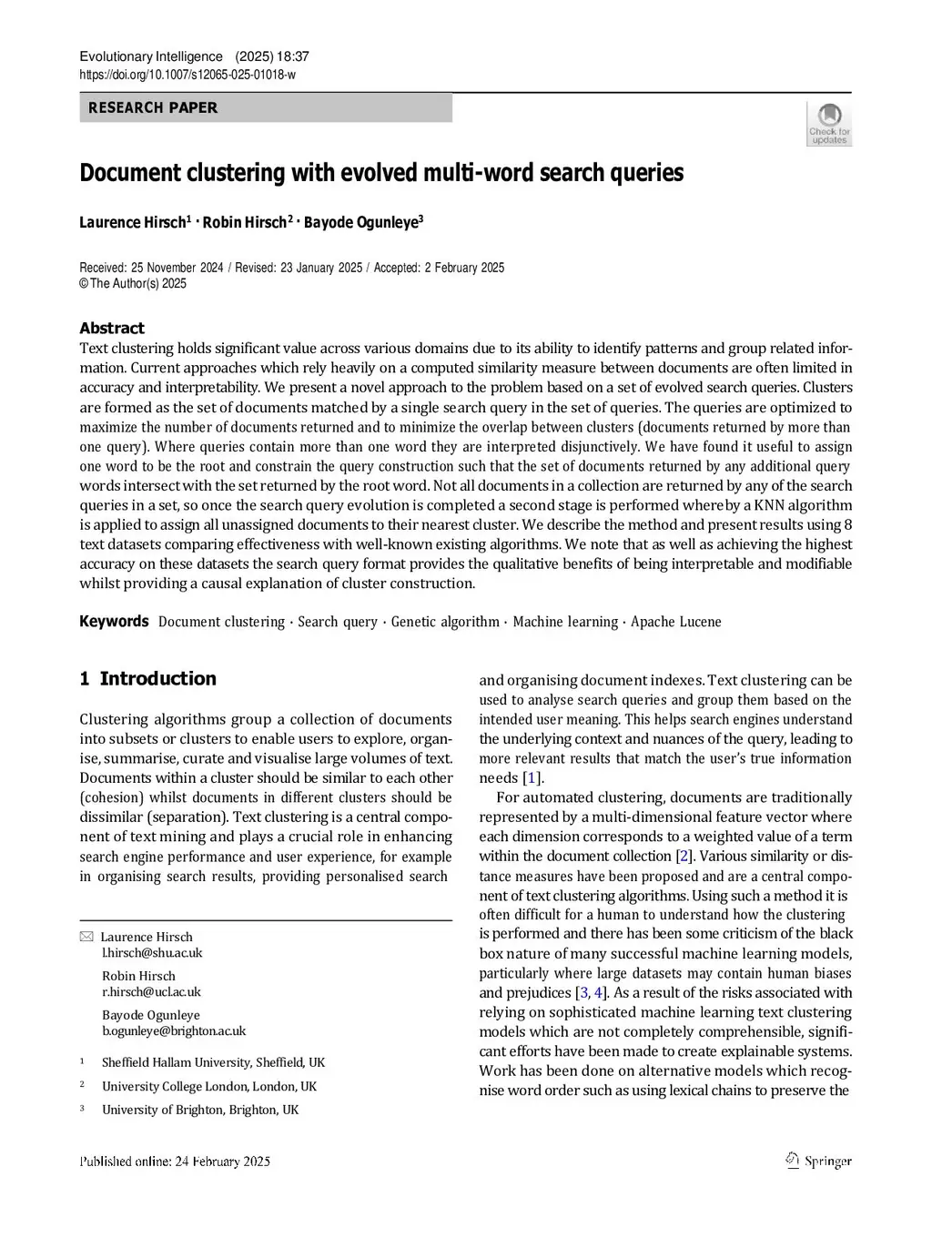 Text clustering holds significant value across various domains due to its ability to identify patterns and group related information. Current approaches which rely heavily on a computed similarity measure between documents are often limited in accuracy and interpretability. We present a novel approach to the problem based on a set of evolved search queries. Clusters are formed as the set of documents matched by a single search query in the set of queries. The queries are optimized to maximize the number of documents returned and to minimize the overlap between clusters (documents returned by more than one query). Where queries contain more than one word they are interpreted disjunctively. We have found it useful to assign one word to be the root and constrain the query construction such that the set of documents returned by any additional query words intersect with the set returned by the root word. Not all documents in a collection are returned by any of the search queries in a set, so once the search query evolution is completed a second stage is performed whereby a KNN algorithm is applied to assign all unassigned documents to their nearest cluster. We describe the method and present results using 8 text datasets comparing effectiveness with well-known existing algorithms. We note that as well as achieving the highest accuracy on these datasets the search query format provides the qualitative benefits of being interpretable and modifiable whilst providing a causal explanation of cluster construction.