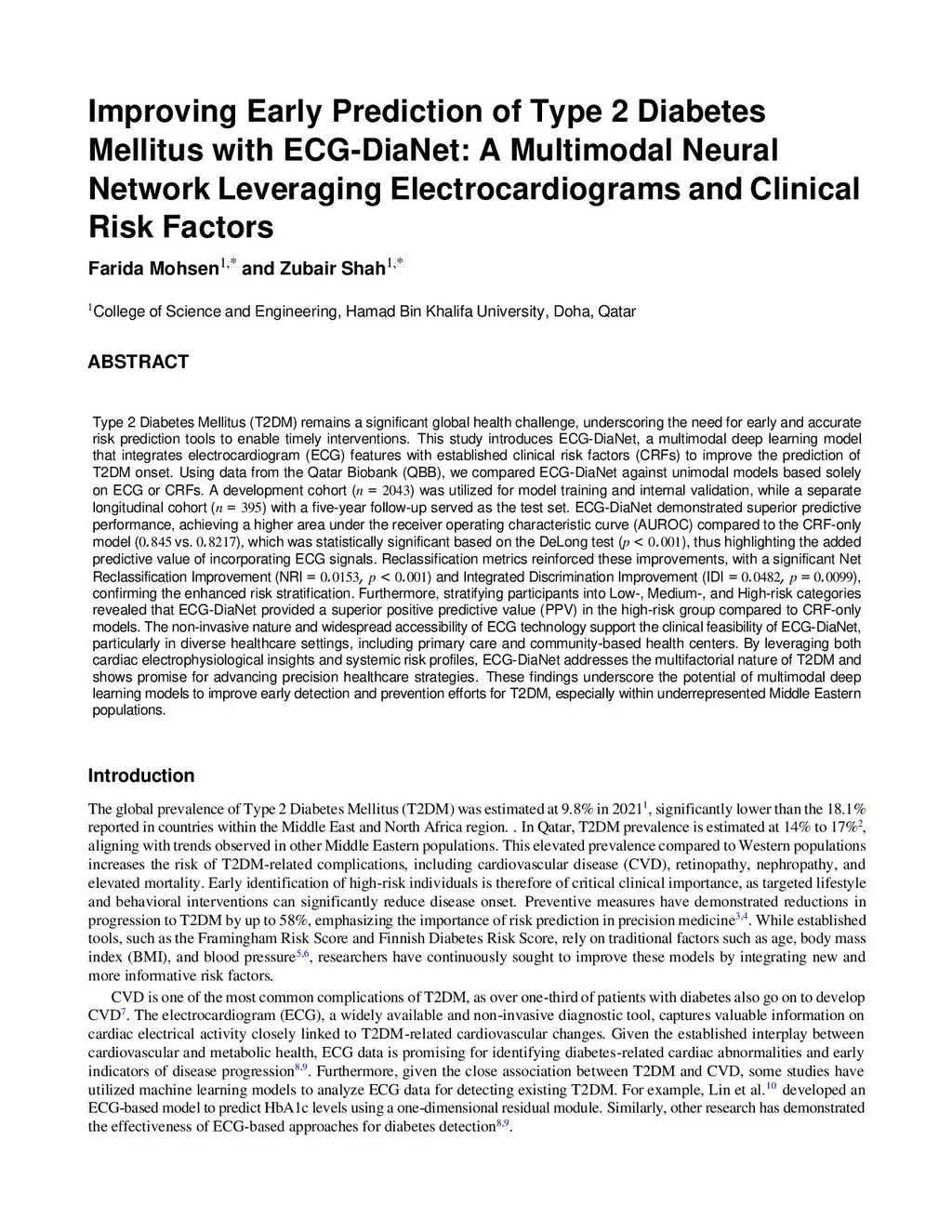 Type 2 Diabetes Mellitus (T2DM) remains a global health challenge, underscoring the need for early and accurate risk prediction. This study presents ECG-DiaNet, a multimodal deep learning model that integrates electrocardiogram (ECG) features with clinical risk factors (CRFs) to enhance T2DM onset prediction. Using data from Qatar Biobank (QBB), we trained and validated models on a development cohort (n=2043) and evaluated performance on a longitudinal test set (n=395) with five-year follow-up. ECG-DiaNet outperformed unimodal ECG-only and CRF-only models, achieving a higher AUROC (0.845 vs 0.8217) than the CRF-only model, with statistical significance (DeLong p<0.001). Reclassification metrics further confirmed improvements: Net Reclassification Improvement (NRI=0.0153) and Integrated Discrimination Improvement (IDI=0.0482). Risk stratification into low-, medium-, and high-risk groups showed ECG-DiaNet achieved superior positive predictive value (PPV) in high-risk individuals. The model's reliance on non-invasive and widely available ECG signals supports its feasibility in clinical and community health settings. By combining cardiac electrophysiology and systemic risk profiles, ECG-DiaNet addresses the multifactorial nature of T2DM and supports precision prevention. These findings highlight the value of multimodal AI in advancing early detection and prevention strategies for T2DM, particularly in underrepresented Middle Eastern populations.