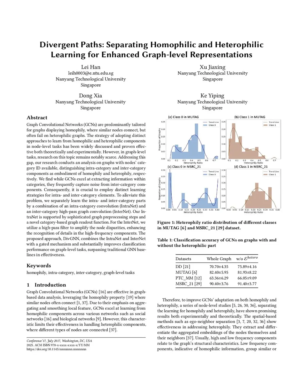 Graph Convolutional Networks (GCNs) are predominantly tailored for graphs displaying homophily, where similar nodes connect, but often fail on heterophilic graphs. The strategy of adopting distinct approaches to learn from homophilic and heterophilic components in node-level tasks has been widely discussed and proven effective both theoretically and experimentally. However, in graph-level tasks, research on this topic remains notably scarce. Addressing this gap, our research conducts an analysis on graphs with nodes' category ID available, distinguishing intra-category and inter-category components as embodiment of homophily and heterophily, respectively. We find while GCNs excel at extracting information within categories, they frequently capture noise from inter-category components. Consequently, it is crucial to employ distinct learning strategies for intra- and inter-category elements. To alleviate this problem, we separately learn the intra- and inter-category parts by a combination of an intra-category convolution (IntraNet) and an inter-category high-pass graph convolution (InterNet). Our IntraNet is supported by sophisticated graph preprocessing steps and a novel category-based graph readout function. For the InterNet, we utilize a high-pass filter to amplify the node disparities, enhancing the recognition of details in the high-frequency components. The proposed approach, DivGNN, combines the IntraNet and InterNet with a gated mechanism and substantially improves classification performance on graph-level tasks, surpassing traditional GNN baselines in effectiveness.
