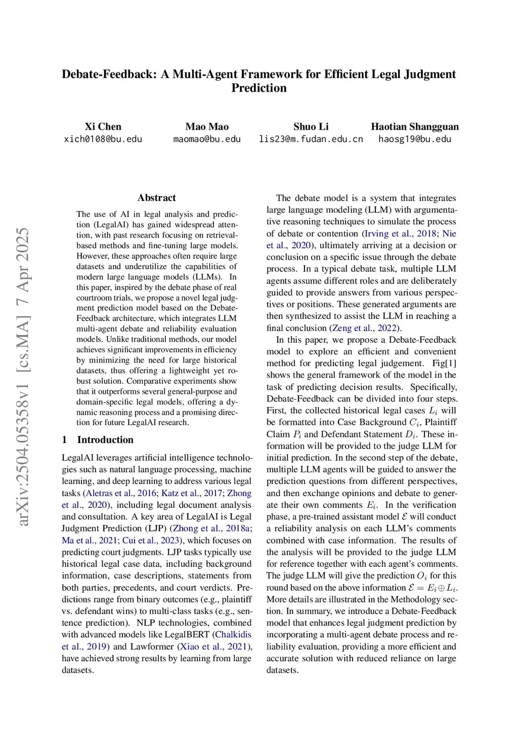 The use of AI in legal analysis and prediction (LegalAI) has gained widespread attention, with past research focusing on retrieval-based methods and fine-tuning large models. However, these approaches often require large datasets and underutilize the capabilities of modern large language models (LLMs). In this paper, inspired by the debate phase of real courtroom trials, we propose a novel legal judgment prediction model based on the Debate-Feedback architecture, which integrates LLM multi-agent debate and reliability evaluation models. Unlike traditional methods, our model achieves significant improvements in efficiency by minimizing the need for large historical datasets, thus offering a lightweight yet robust solution. Comparative experiments show that it outperforms several general-purpose and domain-specific legal models, offering a dynamic reasoning process and a promising direction for future LegalAI research.