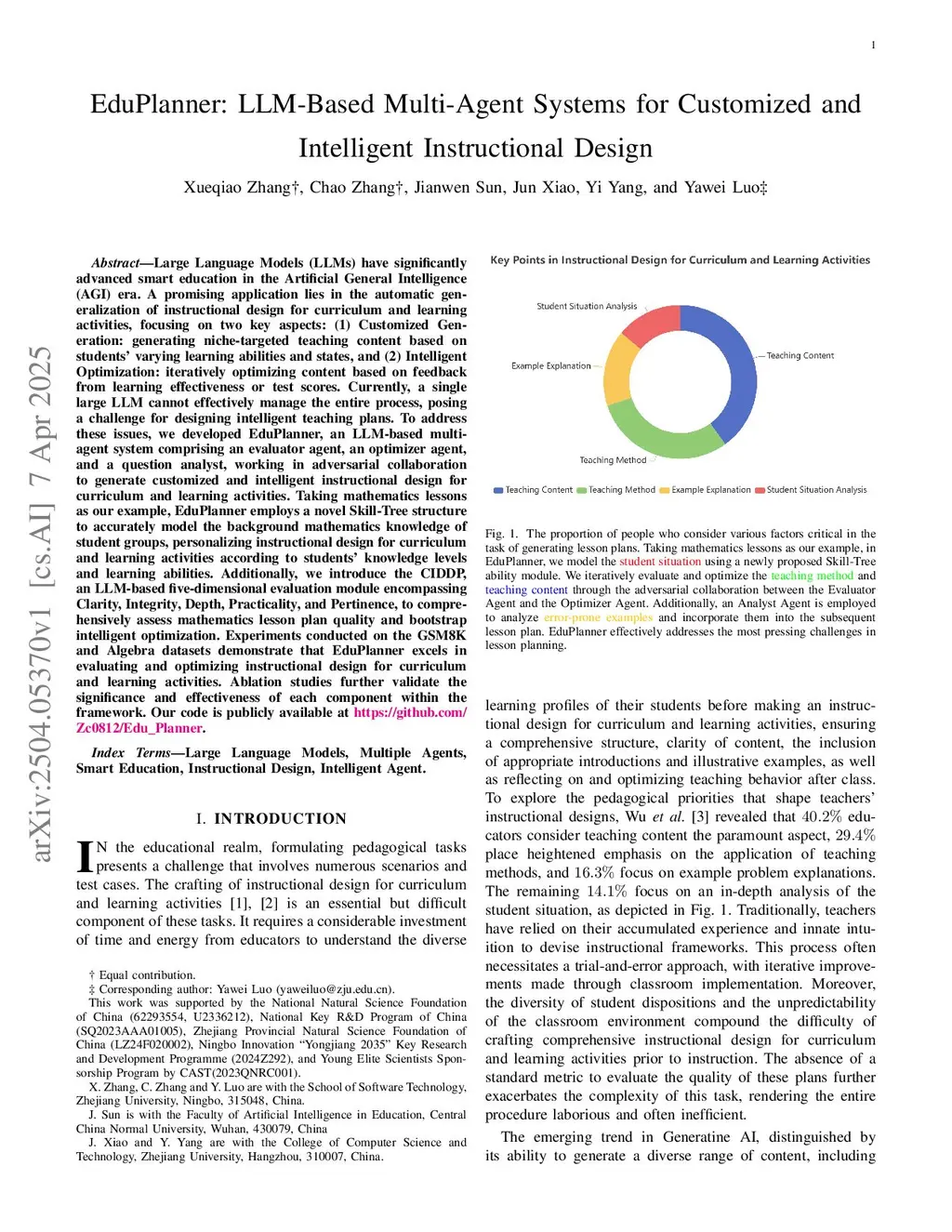Large Language Models (LLMs) have significantly advanced smart education in the Artificial General Intelligence (AGI) era. A promising application lies in the automatic generalization of instructional design for curriculum and learning activities, focusing on two key aspects: (1) Customized Generation: generating niche-targeted teaching content based on students' varying learning abilities and states, and (2) Intelligent Optimization: iteratively optimizing content based on feedback from learning effectiveness or test scores. Currently, a single large LLM cannot effectively manage the entire process, posing a challenge for designing intelligent teaching plans. To address these issues, we developed EduPlanner, an LLM-based multi-agent system comprising an evaluator agent, an optimizer agent, and a question analyst, working in adversarial collaboration to generate customized and intelligent instructional design for curriculum and learning activities. Taking mathematics lessons as our example, EduPlanner employs a novel Skill-Tree structure to accurately model the background mathematics knowledge of student groups, personalizing instructional design for curriculum and learning activities according to students' knowledge levels and learning abilities. Additionally, we introduce the CIDDP, an LLM-based five-dimensional evaluation module encompassing clarity, Integrity, Depth, Practicality, and Pertinence, to comprehensively assess mathematics lesson plan quality and bootstrap intelligent optimization. Experiments conducted on the GSM8K and Algebra datasets demonstrate that EduPlanner excels in evaluating and optimizing instructional design for curriculum and learning activities. Ablation studies further validate the significance and effectiveness of each component within the framework. Our code is publicly available atthis https URL