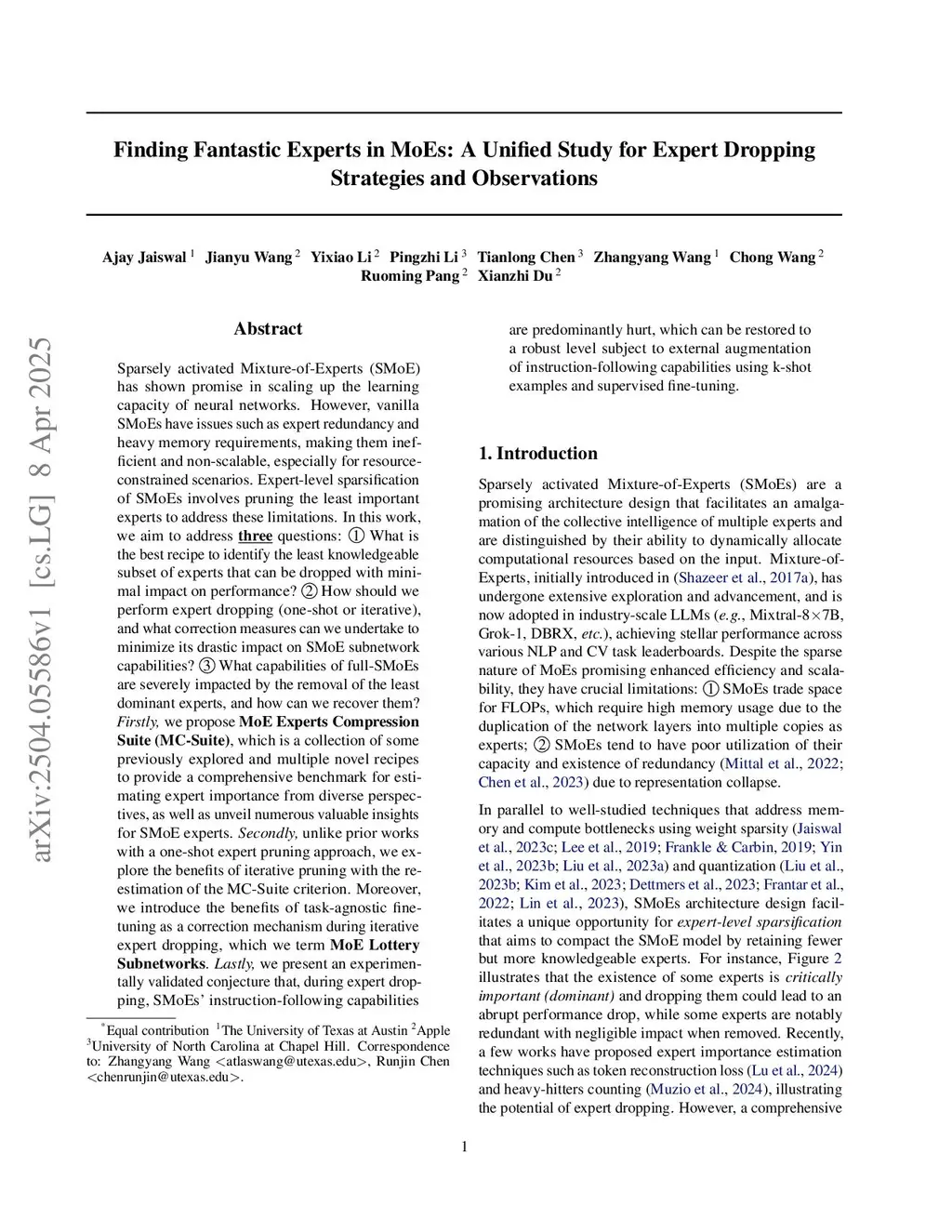Sparsely activated Mixture-of-Experts (SMoE) has shown promise in scaling up the learning capacity of neural networks. However, vanilla SMoEs have issues such as expert redundancy and heavy memory requirements, making them inefficient and non-scalable, especially for resource-constrained scenarios. Expert-level sparsification of SMoEs involves pruning the least important experts to address these limitations. In this work, we aim to address three questions: (1) What is the best recipe to identify the least knowledgeable subset of experts that can be dropped with minimal impact on performance? (2) How should we perform expert dropping (one-shot or iterative), and what correction measures can we undertake to minimize its drastic impact on SMoE subnetwork capabilities? (3) What capabilities of full-SMoEs are severely impacted by the removal of the least dominant experts, and how can we recover them? Firstly, we propose MoE Experts Compression Suite (MC-Suite), which is a collection of some previously explored and multiple novel recipes to provide a comprehensive benchmark for estimating expert importance from diverse perspectives, as well as unveil numerous valuable insights for SMoE experts. Secondly, unlike prior works with a one-shot expert pruning approach, we explore the benefits of iterative pruning with the re-estimation of the MC-Suite criterion. Moreover, we introduce the benefits of task-agnostic fine-tuning as a correction mechanism during iterative expert dropping, which we term MoE Lottery Subnetworks. Lastly, we present an experimentally validated conjecture that, during expert dropping, SMoEs' instruction-following capabilities are predominantly hurt, which can be restored to a robust level subject to external augmentation of instruction-following capabilities using k-shot examples and supervised fine-tuning.