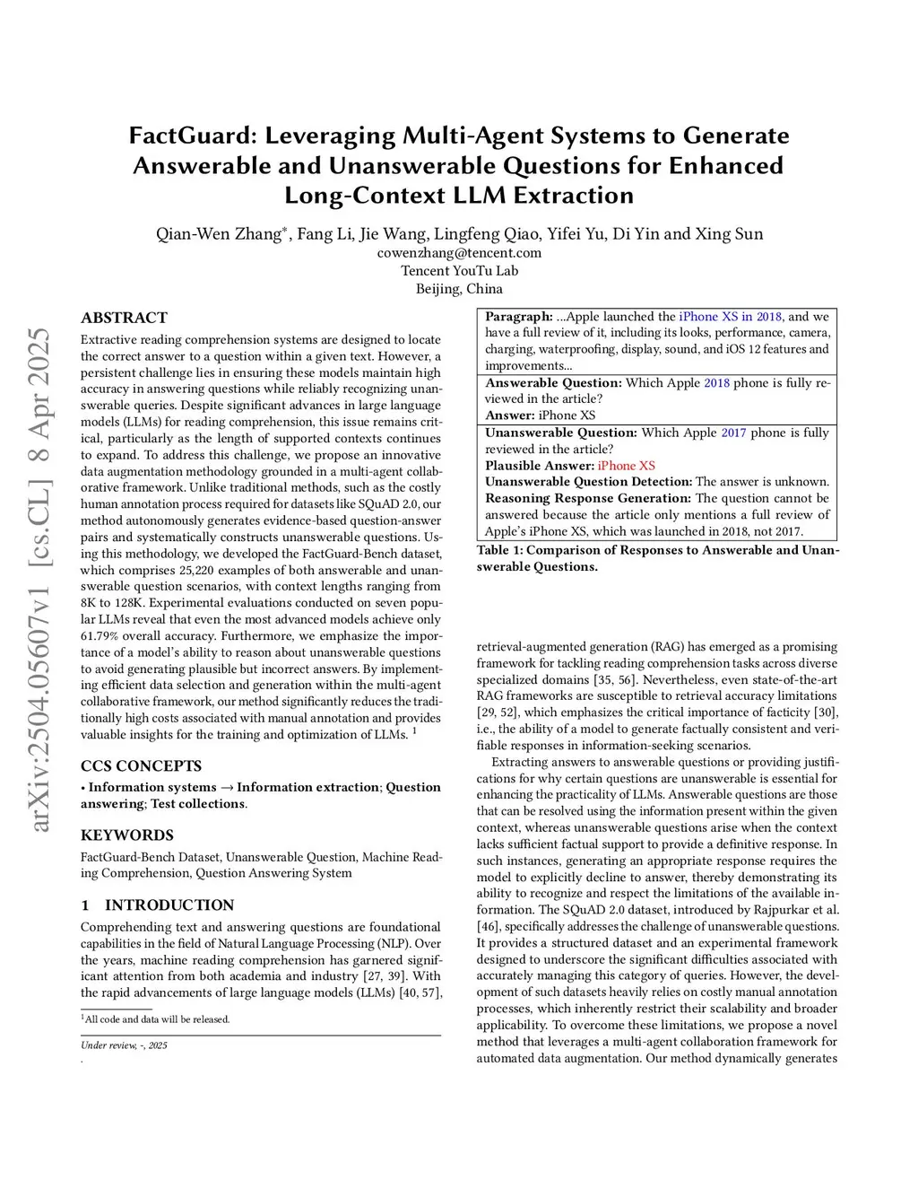 Extractive reading comprehension systems are designed to locate the correct answer to a question within a given text. However, a persistent challenge lies in ensuring these models maintain high accuracy in answering questions while reliably recognizing unanswerable queries. Despite significant advances in large language models (LLMs) for reading comprehension, this issue remains critical, particularly as the length of supported contexts continues to expand. To address this challenge, we propose an innovative data augmentation methodology grounded in a multi-agent collaborative framework. Unlike traditional methods, such as the costly human annotation process required for datasets like SQuAD 2.0, our method autonomously generates evidence-based question-answer pairs and systematically constructs unanswerable questions. Using this methodology, we developed the FactGuard-Bench dataset, which comprises 25,220 examples of both answerable and unanswerable question scenarios, with context lengths ranging from 8K to 128K. Experimental evaluations conducted on seven popular LLMs reveal that even the most advanced models achieve only 61.79% overall accuracy. Furthermore, we emphasize the importance of a model's ability to reason about unanswerable questions to avoid generating plausible but incorrect answers. By implementing efficient data selection and generation within the multi-agent collaborative framework, our method significantly reduces the traditionally high costs associated with manual annotation and provides valuable insights for the training and optimization of LLMs.