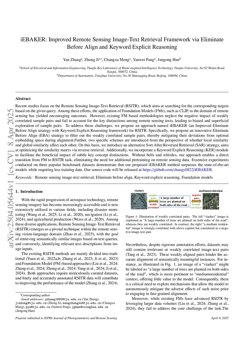 iEBAKER: Improved Remote Sensing Image-Text Retrieval Framework via Eliminate Before Align and Keyword Explicit Reasoning