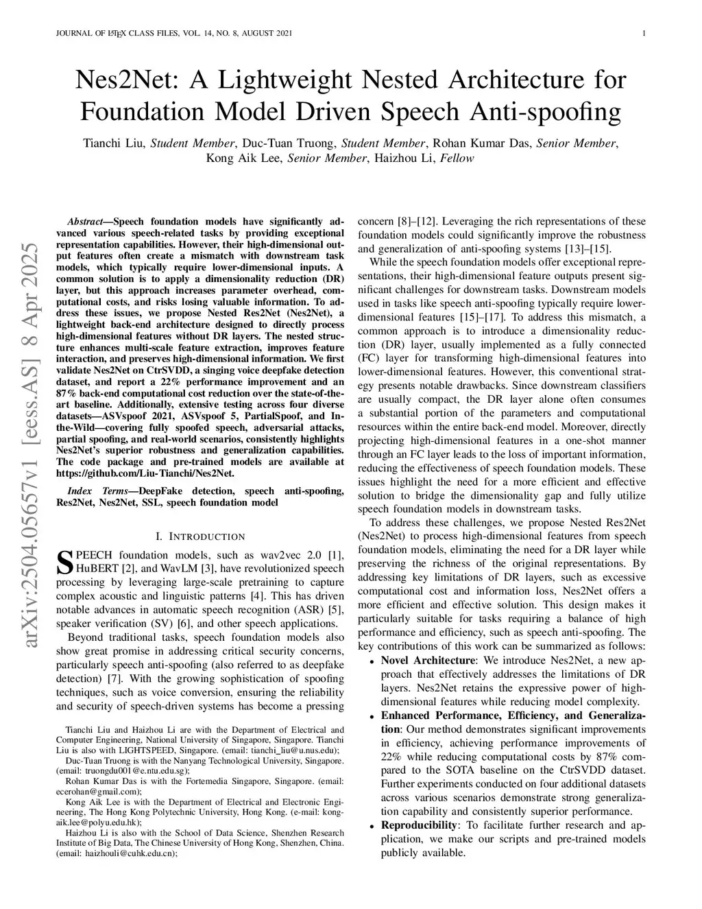 Speech foundation models have significantly advanced various speech-related tasks by providing exceptional representation capabilities. However, their high-dimensional output features often create a mismatch with downstream task models, which typically require lower-dimensional inputs. A common solution is to apply a dimensionality reduction (DR) layer, but this approach increases parameter overhead, computational costs, and risks losing valuable information. To address these issues, we propose Nested Res2Net (Nes2Net), a lightweight back-end architecture designed to directly process high-dimensional features without DR layers. The nested structure enhances multi-scale feature extraction, improves feature interaction, and preserves high-dimensional information. We first validate Nes2Net on CtrSVDD, a singing voice deepfake detection dataset, and report a 22% performance improvement and an 87% back-end computational cost reduction over the state-of-the-art baseline. Additionally, extensive testing across four diverse datasets: ASVspoof 2021, ASVspoof 5, PartialSpoof, and In-the-Wild, covering fully spoofed speech, adversarial attacks, partial spoofing, and real-world scenarios, consistently highlights Nes2Net's superior robustness and generalization capabilities. The code package and pre-trained models are available atthis https URL.