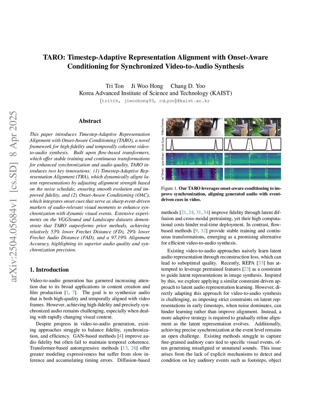 This paper introduces Timestep-Adaptive Representation Alignment with Onset-Aware Conditioning (TARO), a novel framework for high-fidelity and temporally coherent video-to-audio synthesis. Built upon flow-based transformers, which offer stable training and continuous transformations for enhanced synchronization and audio quality, TARO introduces two key innovations: (1) Timestep-Adaptive Representation Alignment (TRA), which dynamically aligns latent representations by adjusting alignment strength based on the noise schedule, ensuring smooth evolution and improved fidelity, and (2) Onset-Aware Conditioning (OAC), which integrates onset cues that serve as sharp event-driven markers of audio-relevant visual moments to enhance synchronization with dynamic visual events. Extensive experiments on the VGGSound and Landscape datasets demonstrate that TARO outperforms prior methods, achieving relatively 53% lower Frechet Distance (FD), 29% lower Frechet Audio Distance (FAD), and a 97.19% Alignment Accuracy, highlighting its superior audio quality and synchronization precision.