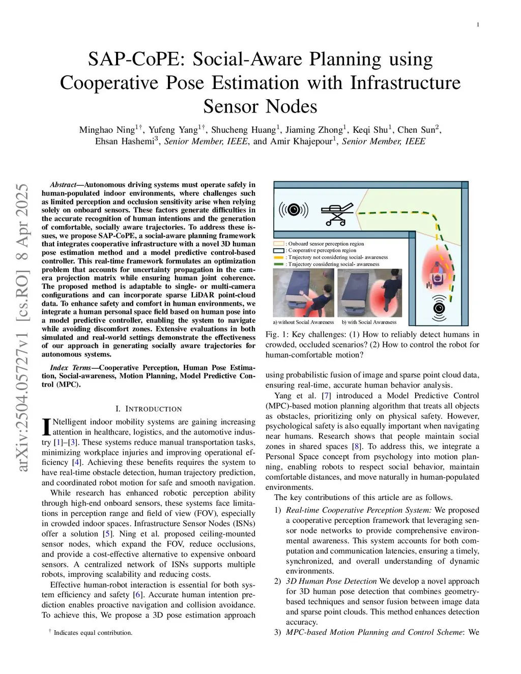 Autonomous driving systems must operate smoothly in human-populated indoor environments, where challenges arise including limited perception and occlusions when relying only on onboard sensors, as well as the need for socially compliant motion planning that accounts for human psychological comfort zones. These factors complicate accurate recognition of human intentions and the generation of comfortable, socially aware trajectories. To address these challenges, we propose SAP-CoPE, an indoor navigation system that integrates cooperative infrastructure with a novel 3D human pose estimation method and a socially-aware model predictive control (MPC)-based motion planner. In the perception module, an optimization problem is formulated to account for uncertainty propagation in the camera projection matrix while enforcing human joint coherence. The proposed method is adaptable to both single- and multi-camera configurations and can incorporate sparse LiDAR point-cloud data. For motion planning, we integrate a psychology inspired personal-space field using the information from estimated human poses into an MPC framework to enhance socially comfort in human-populated environments. Extensive real-world evaluations demonstrate the effectiveness of the proposed approach in generating socially aware trajectories for autonomous systems.