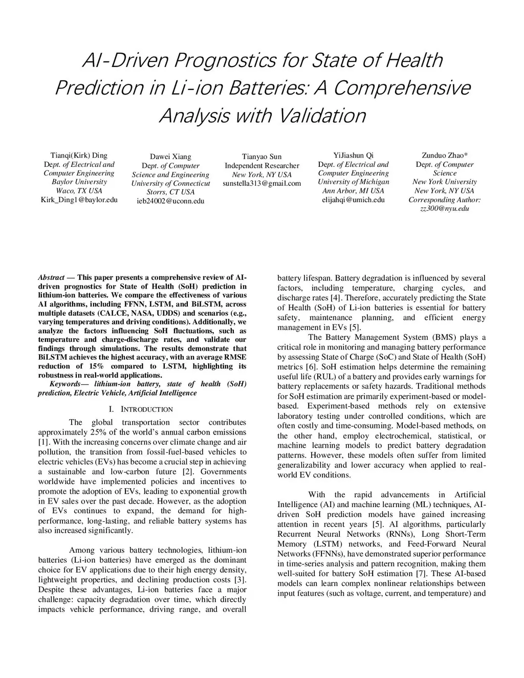 This paper presents a comprehensive review of AI-driven prognostics for State of Health (SoH) prediction in lithium-ion batteries. We compare the effectiveness of various AI algorithms, including FFNN, LSTM, and BiLSTM, across multiple datasets (CALCE, NASA, UDDS) and scenarios (e.g., varying temperatures and driving conditions). Additionally, we analyze the factors influencing SoH fluctuations, such as temperature and charge-discharge rates, and validate our findings through simulations. The results demonstrate that BiLSTM achieves the highest accuracy, with an average RMSE reduction of 15% compared to LSTM, highlighting its robustness in real-world applications.