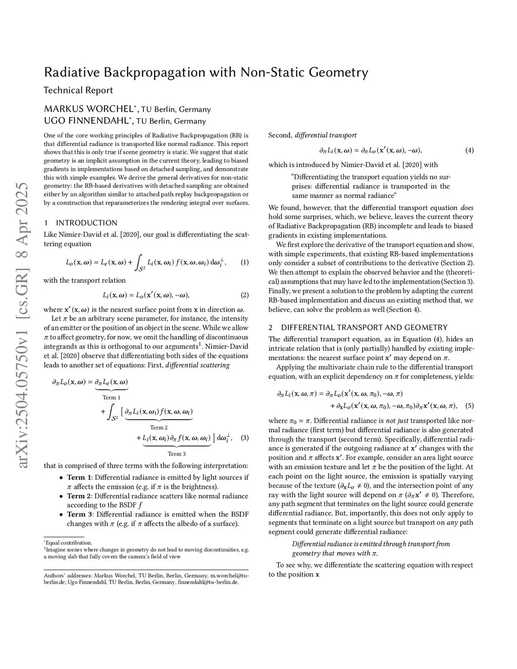 Radiative backpropagation-based (RB) methods efficiently compute reverse-mode derivatives in physically-based differentiable rendering by simulating the propagation of differential radiance. A key assumption is that differential radiance is transported like normal radiance. We observe that this holds only when scene geometry is static and demonstrate that current implementations of radiative backpropagation produce biased gradients when scene parameters change geometry. In this work, we derive the differential transport equation without assuming static geometry. An immediate consequence is that the parameterization matters when the sampling process is not differentiated: only surface integrals allow a local formulation of the derivatives, i.e., one in which moving surfaces do not affect the entire path geometry. While considerable effort has been devoted to handling discontinuities resulting from moving geometry, we show that a biased interior derivative compromises even the simplest inverse rendering tasks, regardless of discontinuities. An implementation based on our derivation leads to systematic convergence to the reference solution in the same setting and provides unbiased RB interior derivatives for path-space differentiable rendering.