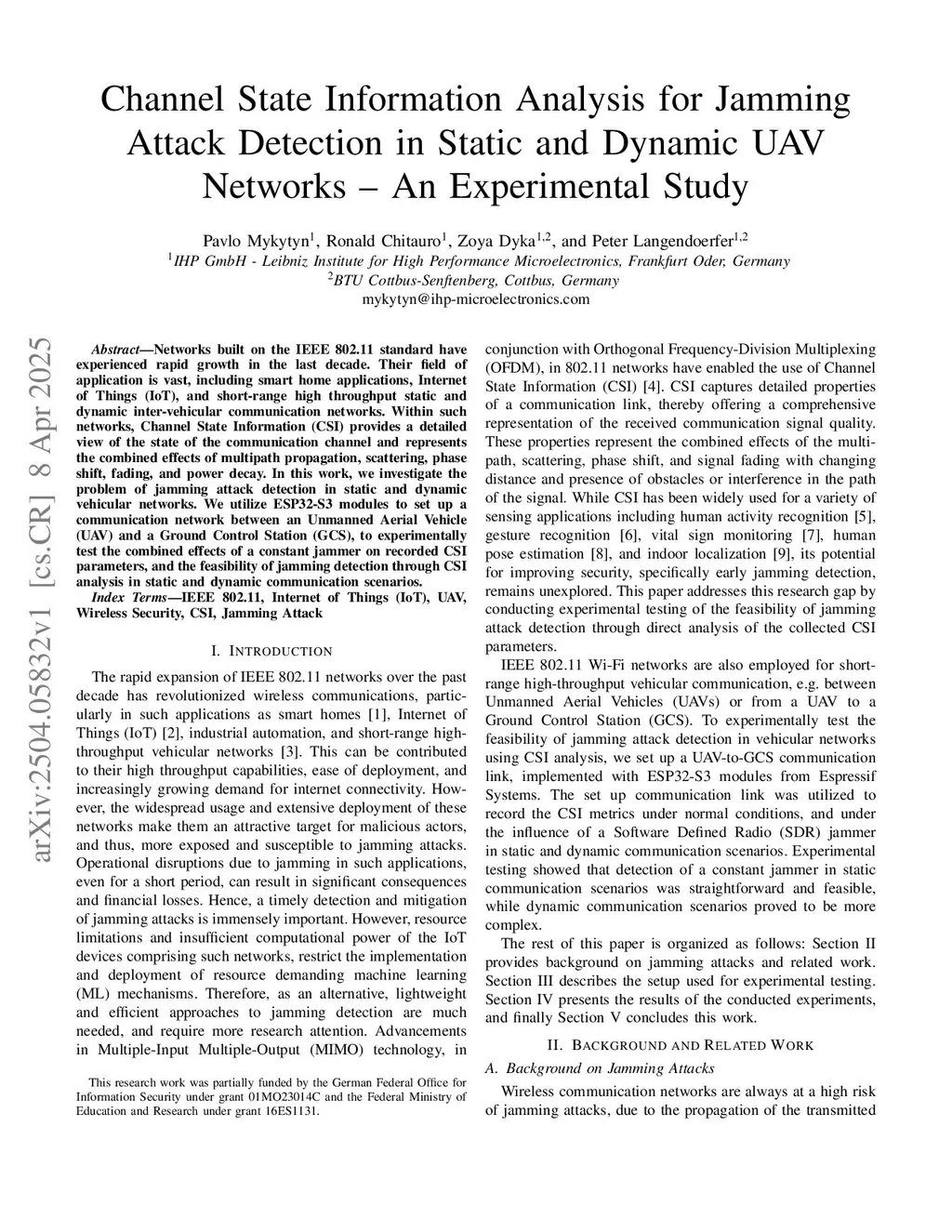 Networks built on the IEEE 802.11 standard have experienced rapid growth in the last decade. Their field of application is vast, including smart home applications, Internet of Things (IoT), and short-range high throughput static and dynamic inter-vehicular communication networks. Within such networks, Channel State Information (CSI) provides a detailed view of the state of the communication channel and represents the combined effects of multipath propagation, scattering, phase shift, fading, and power decay. In this work, we investigate the problem of jamming attack detection in static and dynamic vehicular networks. We utilize ESP32-S3 modules to set up a communication network between an Unmanned Aerial Vehicle (UAV) and a Ground Control Station (GCS), to experimentally test the combined effects of a constant jammer on recorded CSI parameters, and the feasibility of jamming detection through CSI analysis in static and dynamic communication scenarios.