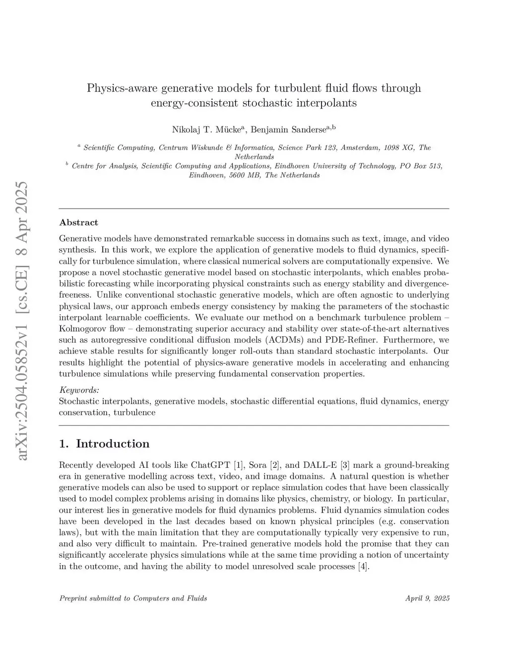 Generative models have demonstrated remarkable success in domains such as text, image, and video synthesis. In this work, we explore the application of generative models to fluid dynamics, specifically for turbulence simulation, where classical numerical solvers are computationally expensive. We propose a novel stochastic generative model based on stochastic interpolants, which enables probabilistic forecasting while incorporating physical constraints such as energy stability and divergence-freeness. Unlike conventional stochastic generative models, which are often agnostic to underlying physical laws, our approach embeds energy consistency by making the parameters of the stochastic interpolant learnable coefficients. We evaluate our method on a benchmark turbulence problem - Kolmogorov flow - demonstrating superior accuracy and stability over state-of-the-art alternatives such as autoregressive conditional diffusion models (ACDMs) and PDE-Refiner. Furthermore, we achieve stable results for significantly longer roll-outs than standard stochastic interpolants. Our results highlight the potential of physics-aware generative models in accelerating and enhancing turbulence simulations while preserving fundamental conservation properties.