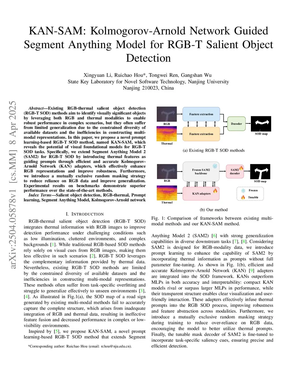 Existing RGB-thermal salient object detection (RGB-T SOD) methods aim to identify visually significant objects by leveraging both RGB and thermal modalities to enable robust performance in complex scenarios, but they often suffer from limited generalization due to the constrained diversity of available datasets and the inefficiencies in constructing multi-modal representations. In this paper, we propose a novel prompt learning-based RGB-T SOD method, named KAN-SAM, which reveals the potential of visual foundational models for RGB-T SOD tasks. Specifically, we extend Segment Anything Model 2 (SAM2) for RGB-T SOD by introducing thermal features as guiding prompts through efficient and accurate Kolmogorov-Arnold Network (KAN) adapters, which effectively enhance RGB representations and improve robustness. Furthermore, we introduce a mutually exclusive random masking strategy to reduce reliance on RGB data and improve generalization. Experimental results on benchmarks demonstrate superior performance over the state-of-the-art methods.