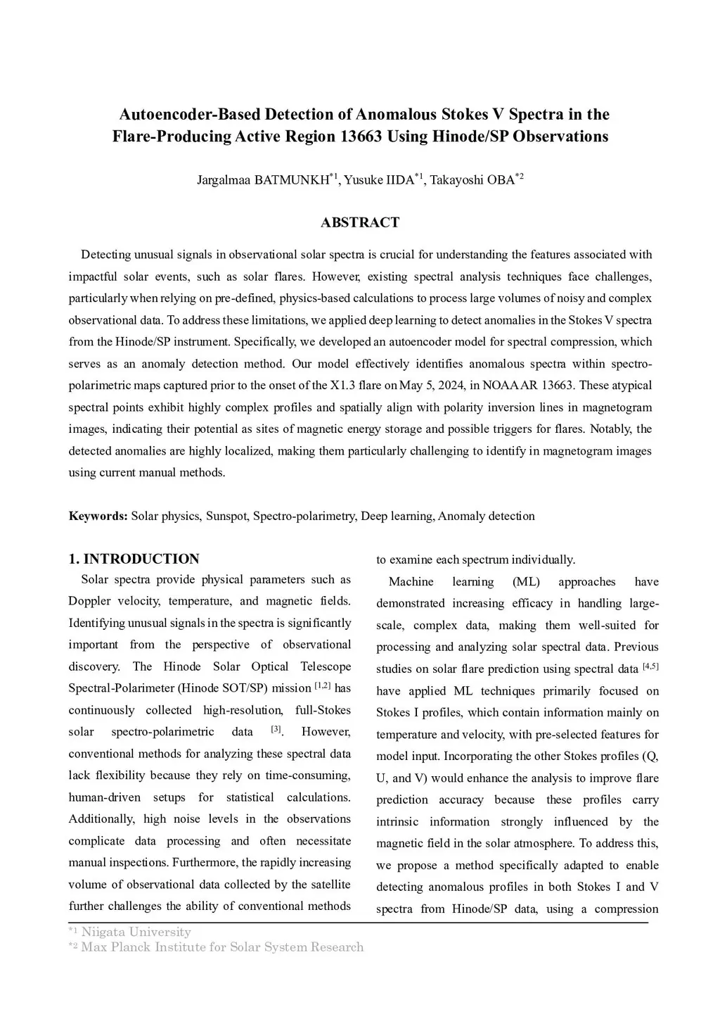 Detecting unusual signals in observational solar spectra is crucial for understanding the features associated with impactful solar events, such as solar flares. However, existing spectral analysis techniques face challenges, particularly when relying on pre-defined, physics-based calculations to process large volumes of noisy and complex observational data. To address these limitations, we applied deep learning to detect anomalies in the Stokes V spectra from the Hinode/SP instrument. Specifically, we developed an autoencoder model for spectral compression, which serves as an anomaly detection method. Our model effectively identifies anomalous spectra within spectro-polarimetric maps captured prior to the onset of the X1.3 flare on May 5, 2024, in NOAA AR 13663. These atypical spectral points exhibit highly complex profiles and spatially align with polarity inversion lines in magnetogram images, indicating their potential as sites of magnetic energy storage and possible triggers for flares. Notably, the detected anomalies are highly localized, making them particularly challenging to identify in magnetogram images using current manual methods.
