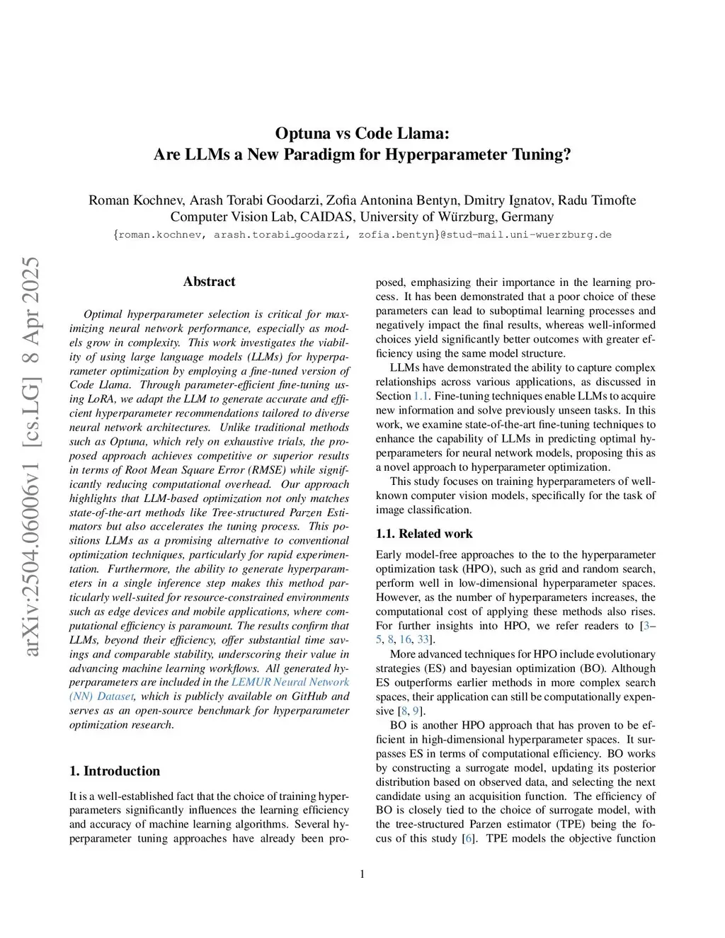 Optimal hyperparameter selection is critical for maximizing the performance of neural networks in computer vision, particularly as architectures become more complex. This work explores the use of large language models (LLMs) for hyperparameter optimization by fine-tuning a parameter-efficient version of Code Llama using LoRA. The resulting model produces accurate and computationally efficient hyperparameter recommendations across a wide range of vision architectures. Unlike traditional methods such as Optuna, which rely on resource-intensive trial-and-error procedures, our approach achieves competitive or superior Root Mean Square Error (RMSE) while substantially reducing computational overhead. Importantly, the models evaluated span image-centric tasks such as classification, detection, and segmentation, fundamental components in many image manipulation pipelines including enhancement, restoration, and style transfer. Our results demonstrate that LLM-based optimization not only rivals established Bayesian methods like Tree-structured Parzen Estimators (TPE), but also accelerates tuning for real-world applications requiring perceptual quality and low-latency processing. All generated configurations are publicly available in the LEMUR Neural Network Dataset (this https URL), which serves as an open source benchmark for hyperparameter optimization research and provides a practical resource to improve training efficiency in image manipulation systems.