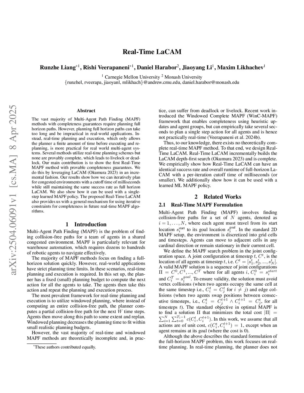 The vast majority of Multi-Agent Path Finding (MAPF) methods with completeness guarantees require planning full-horizon paths. However, planning full-horizon paths can take too long and be impractical in real-world applications. Instead, real-time planning and execution, which only allows the planner a finite amount of time before executing and replanning, is more practical for real-world multi-agent systems. Several methods utilize real-time planning schemes but none are provably complete, which leads to livelock or deadlock. Our main contribution is Real-Time LaCAM, the first Real-Time MAPF method with provable completeness guarantees. We do this by leveraging LaCAM (Okumura 2023) in an incremental fashion. Our results show how we can iteratively plan for congested environments with a cutoff time of milliseconds while still maintaining the same success rate as full-horizon LaCAM. We also show how it can be used with a single-step learned MAPF policy.
