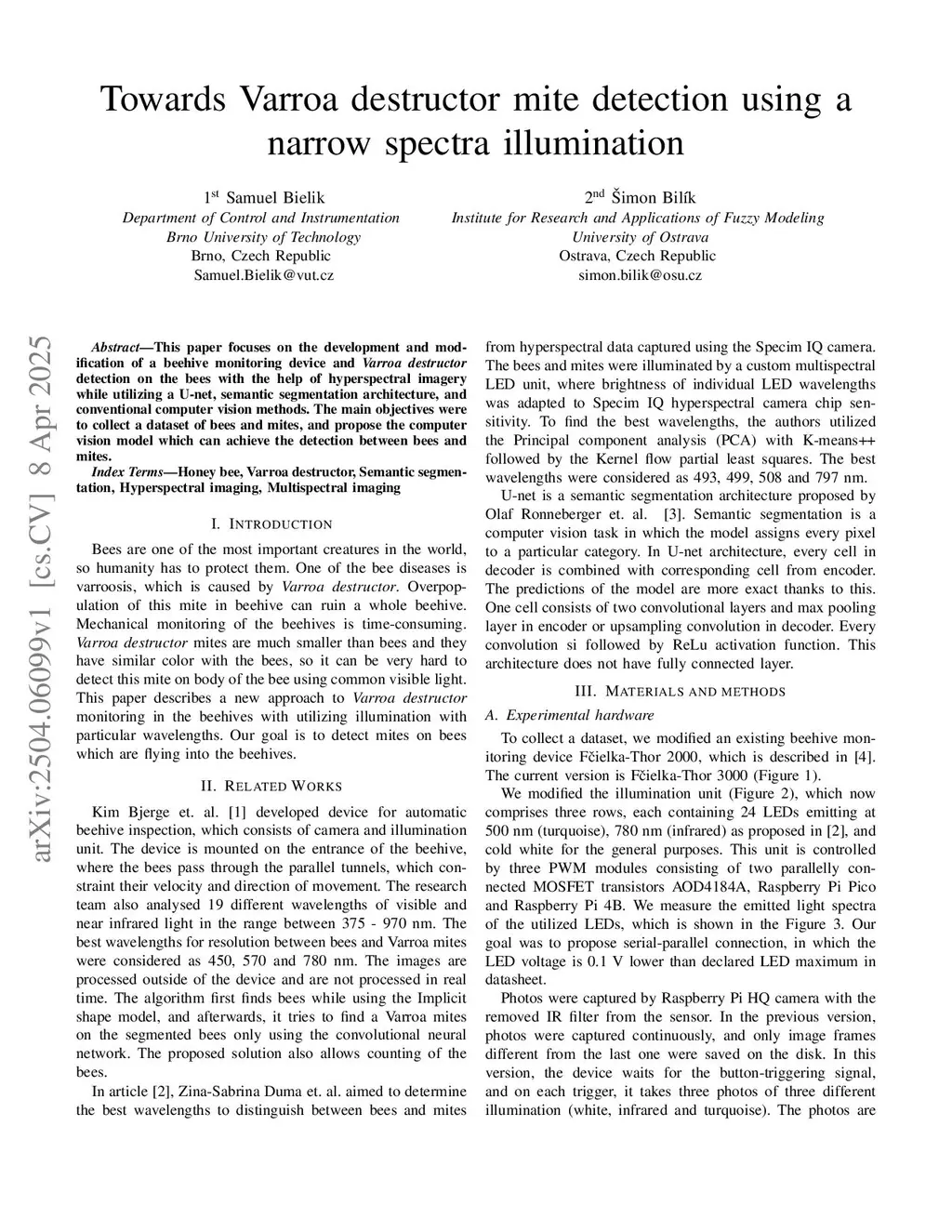 This paper focuses on the development and modification of a beehive monitoring device and Varroa destructor detection on the bees with the help of hyperspectral imagery while utilizing a U-net, semantic segmentation architecture, and conventional computer vision methods. The main objectives were to collect a dataset of bees and mites, and propose the computer vision model which can achieve the detection between bees and mites.