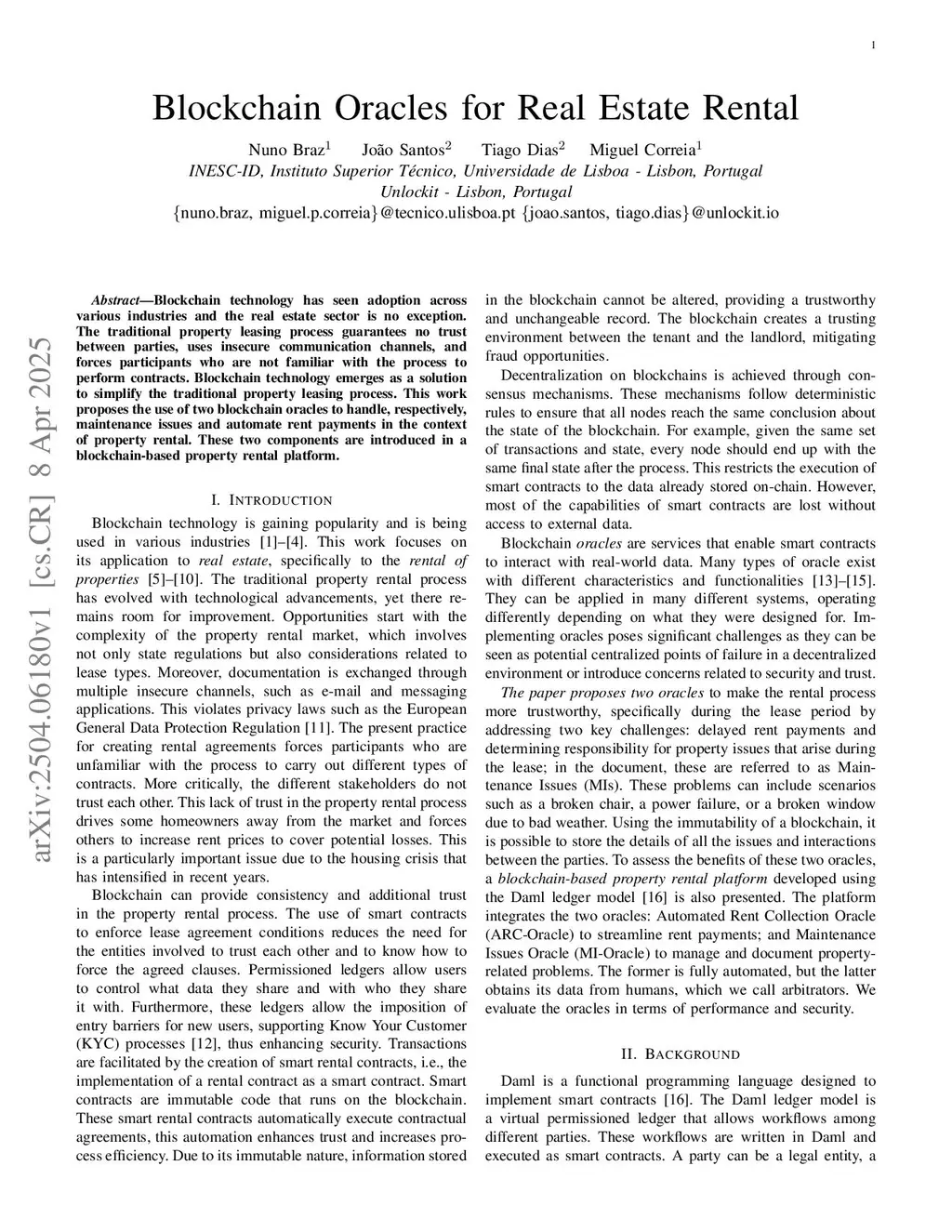 Blockchain technology has seen adoption across various industries and the real estate sector is no exception. The traditional property leasing process guarantees no trust between parties, uses insecure communication channels, and forces participants who are not familiar with the process to perform contracts. Blockchain technology emerges as a solution to simplify the traditional property leasing process. This work proposes the use of two blockchain oracles to handle, respectively, maintenance issues and automate rent payments in the context of property rental. These two components are introduced in a blockchain-based property rental platform.