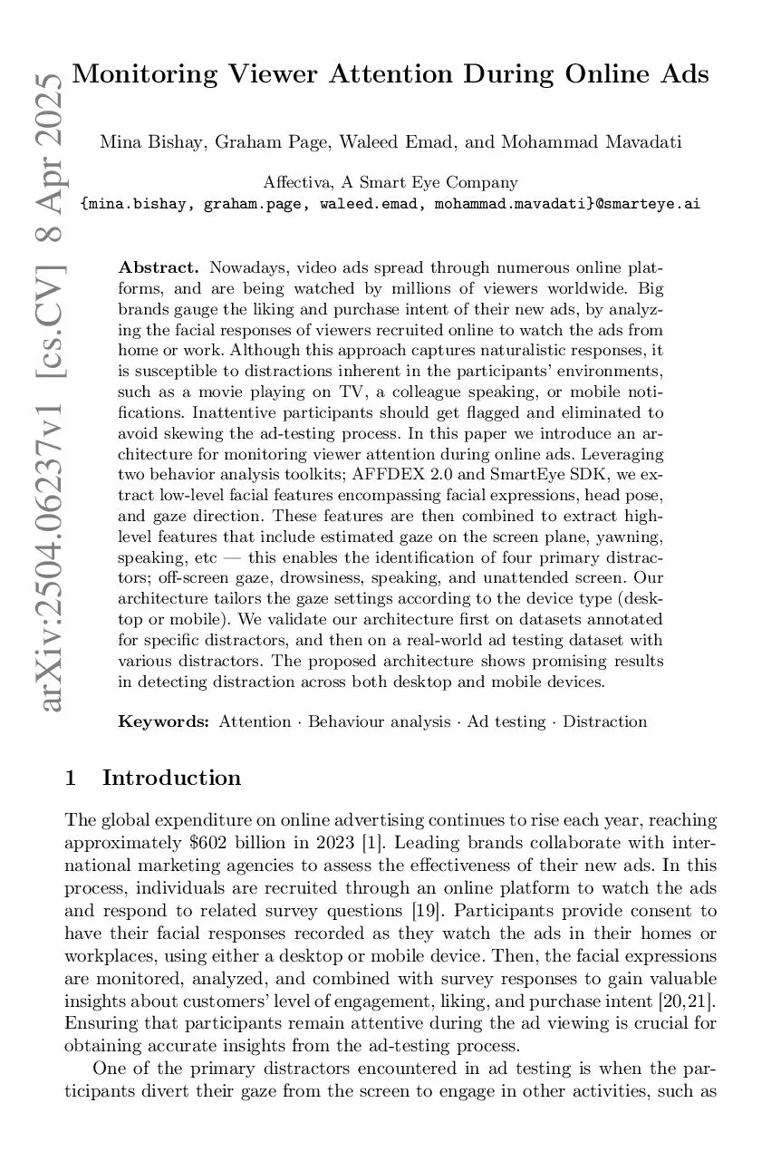 Nowadays, video ads spread through numerous online platforms, and are being watched by millions of viewers worldwide. Big brands gauge the liking and purchase intent of their new ads, by analyzing the facial responses of viewers recruited online to watch the ads from home or work. Although this approach captures naturalistic responses, it is susceptible to distractions inherent in the participants' environments, such as a movie playing on TV, a colleague speaking, or mobile notifications. Inattentive participants should get flagged and eliminated to avoid skewing the ad-testing process. In this paper we introduce an architecture for monitoring viewer attention during online ads. Leveraging two behavior analysis toolkits; AFFDEX 2.0 and SmartEye SDK, we extract low-level facial features encompassing facial expressions, head pose, and gaze direction. These features are then combined to extract high-level features that include estimated gaze on the screen plane, yawning, speaking, etc -- this enables the identification of four primary distractors; off-screen gaze, drowsiness, speaking, and unattended screen. Our architecture tailors the gaze settings according to the device type (desktop or mobile). We validate our architecture first on datasets annotated for specific distractors, and then on a real-world ad testing dataset with various distractors. The proposed architecture shows promising results in detecting distraction across both desktop and mobile devices.