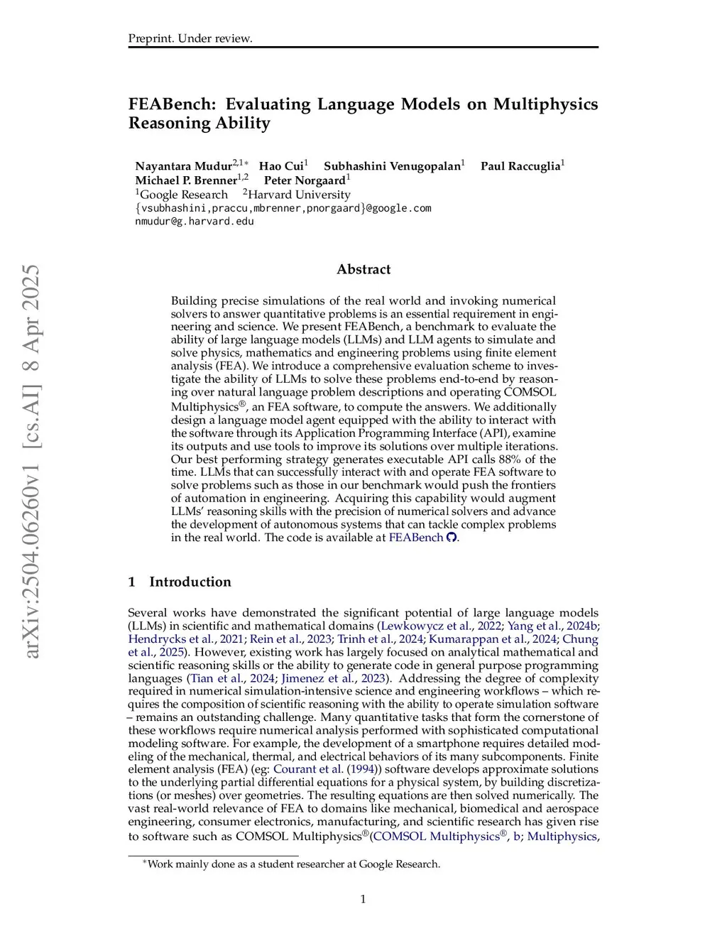 Building precise simulations of the real world and invoking numerical solvers to answer quantitative problems is an essential requirement in engineering and science. We present FEABench, a benchmark to evaluate the ability of large language models (LLMs) and LLM agents to simulate and solve physics, mathematics and engineering problems using finite element analysis (FEA). We introduce a comprehensive evaluation scheme to investigate the ability of LLMs to solve these problems end-to-end by reasoning over natural language problem descriptions and operating COMSOL Multiphysics, an FEA software, to compute the answers. We additionally design a language model agent equipped with the ability to interact with the software through its Application Programming Interface (API), examine its outputs and use tools to improve its solutions over multiple iterations. Our best performing strategy generates executable API calls 88% of the time. LLMs that can successfully interact with and operate FEA software to solve problems such as those in our benchmark would push the frontiers of automation in engineering. Acquiring this capability would augment LLMs' reasoning skills with the precision of numerical solvers and advance the development of autonomous systems that can tackle complex problems in the real world. The code is available atthis https URL