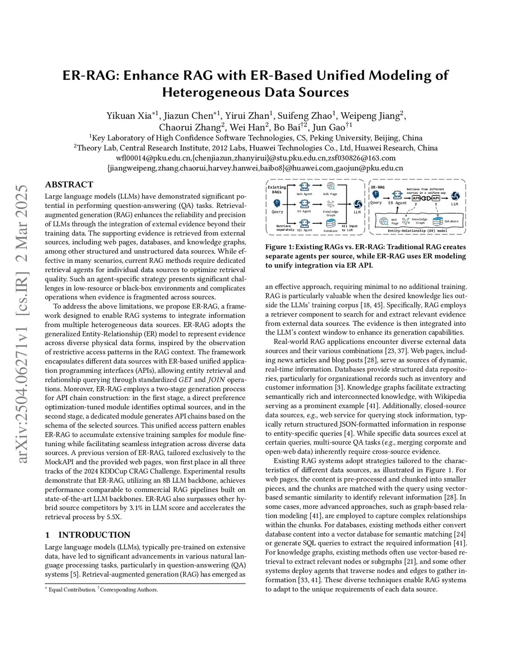 Large language models (LLMs) excel in question-answering (QA) tasks, and retrieval-augmented generation (RAG) enhances their precision by incorporating external evidence from diverse sources like web pages, databases, and knowledge graphs. However, current RAG methods rely on agent-specific strategies for individual data sources, posing challenges low-resource or black-box environments and complicates operations when evidence is fragmented across sources. To address these limitations, we propose ER-RAG, a framework that unifies evidence integration across heterogeneous data sources using the Entity-Relationship (ER) model. ER-RAG standardizes entity retrieval and relationship querying through ER-based APIs with GET and JOIN operations. It employs a two-stage generation process: first, a preference optimization module selects optimal sources; second, another module constructs API chains based on source schemas. This unified approach allows efficient fine-tuning and seamless integration across diverse data sources. ER-RAG demonstrated its effectiveness by winning all three tracks of the 2024 KDDCup CRAG Challenge, achieving performance on par with commercial RAG pipelines using an 8B LLM backbone. It outperformed hybrid competitors by 3.1% in LLM score and accelerated retrieval by 5.5X.