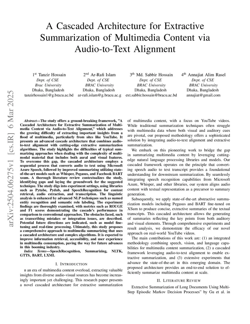 This study presents a cascaded architecture for extractive summarization of multimedia content via audio-to-text alignment. The proposed framework addresses the challenge of extracting key insights from multimedia sources like YouTube videos. It integrates audio-to-text conversion using Microsoft Azure Speech with advanced extractive summarization models, including Whisper, Pegasus, and Facebook BART XSum. The system employs tools such as Pytube, Pydub, and SpeechRecognition for content retrieval, audio extraction, and transcription. Linguistic analysis is enhanced through named entity recognition and semantic role labeling. Evaluation using ROUGE and F1 scores demonstrates that the cascaded architecture outperforms conventional summarization methods, despite challenges like transcription errors. Future improvements may include model fine-tuning and real-time processing. This study contributes to multimedia summarization by improving information retrieval, accessibility, and user experience.