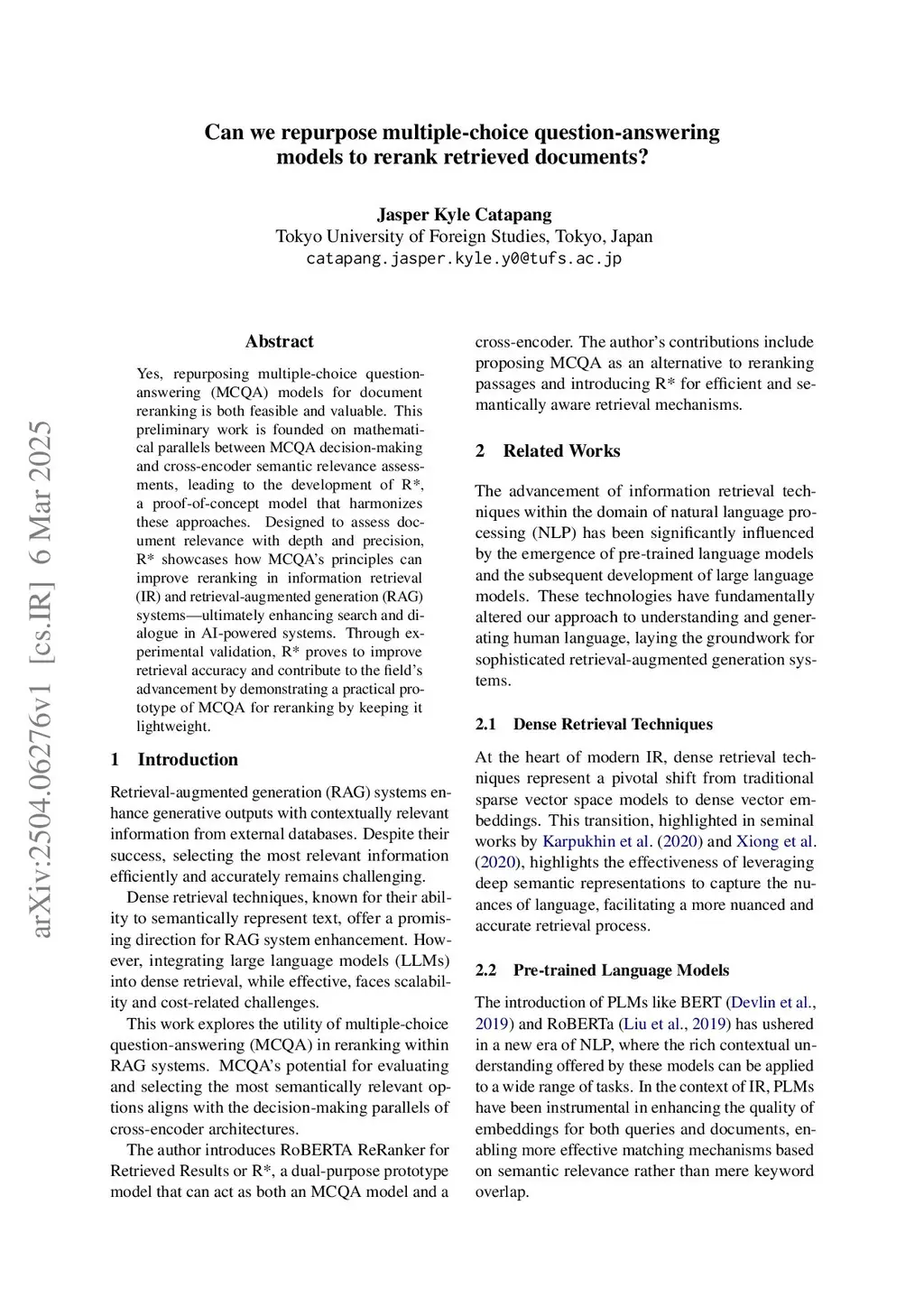 Yes, repurposing multiple-choice question-answering (MCQA) models for document reranking is both feasible and valuable. This preliminary work is founded on mathematical parallels between MCQA decision-making and cross-encoder semantic relevance assessments, leading to the development of R*, a proof-of-concept model that harmonizes these approaches. Designed to assess document relevance with depth and precision, R* showcases how MCQA's principles can improve reranking in information retrieval (IR) and retrieval-augmented generation (RAG) systems -- ultimately enhancing search and dialogue in AI-powered systems. Through experimental validation, R* proves to improve retrieval accuracy and contribute to the field's advancement by demonstrating a practical prototype of MCQA for reranking by keeping it lightweight.