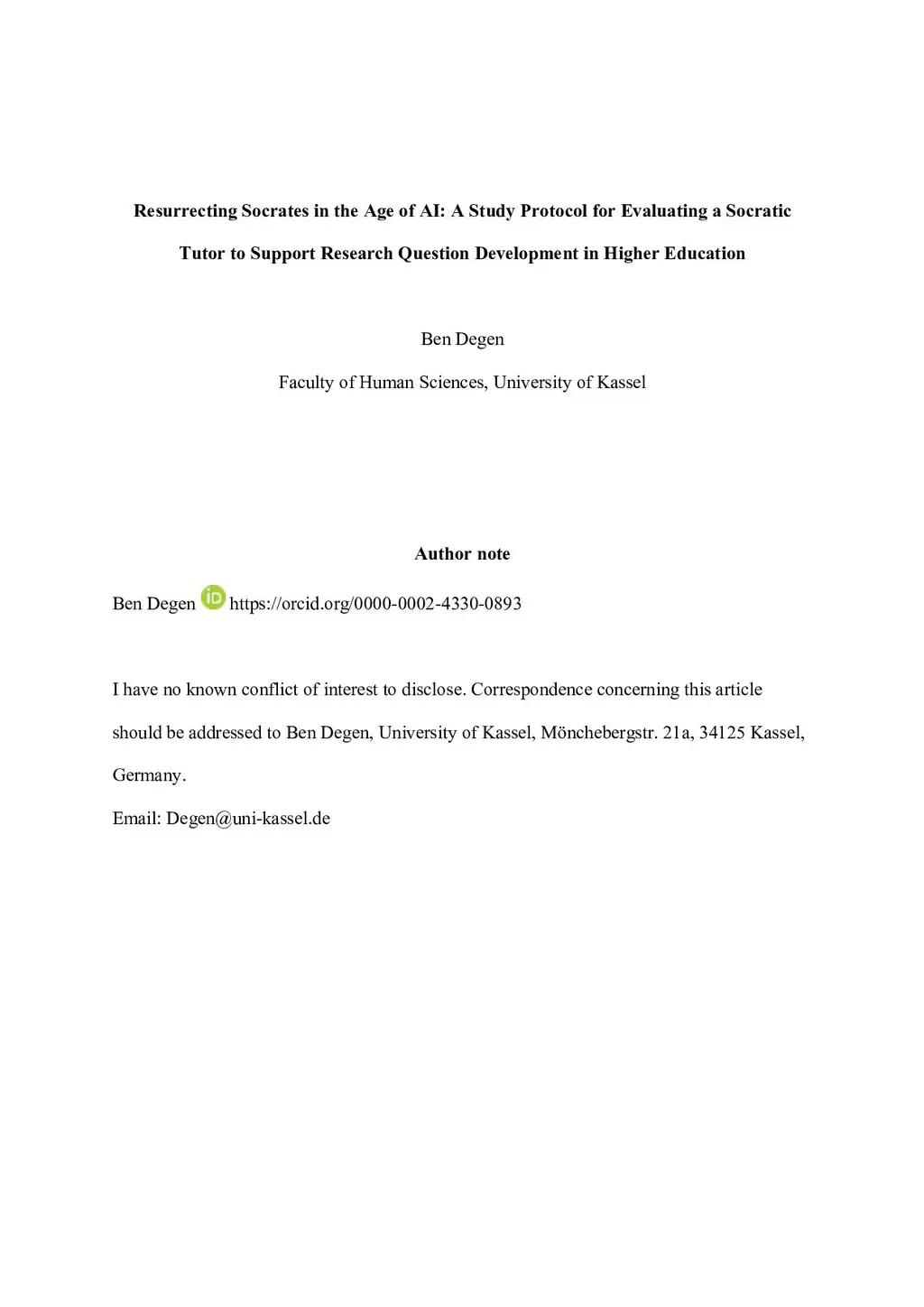 Formulating research questions is a foundational yet challenging academic skill, one that generative AI systems often oversimplify by offering instant answers at the expense of student reflection. This protocol lays out a study grounded in constructivist learning theory to evaluate a novel AI-based Socratic Tutor, designed to foster cognitive engagement and scaffold research question development in higher education. Anchored in dialogic pedagogy, the tutor engages students through iterative, reflective questioning, aiming to promote System 2 thinking and counteract overreliance on AI-generated outputs. In a quasi-experimental design, approximately 80 German pre-service biology teacher students will be randomly assigned to one of two groups: an AI Socratic Tutor condition and an uninstructed chatbot control. Across multiple cycles, students are expected to formulate research questions based on background texts, with quality assessed through double-blind expert review. The study also examines transfer of skills to novel phenomena and captures student perceptions through mixed-methods analysis, including surveys, interviews and reflective journals. This study aims to advance the understanding of how generative AI can be pedagogically aligned to support, not replace, human cognition and offers design principles for human-AI collaboration in education.