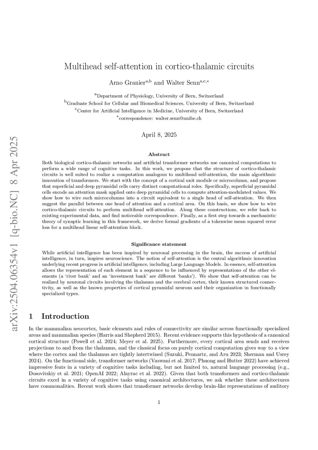 Both biological cortico-thalamic networks and artificial transformer networks use canonical computations to perform a wide range of cognitive tasks. In this work, we propose that the structure of cortico-thalamic circuits is well suited to realize a computation analogous to multihead self-attention, the main algorithmic innovation of transformer networks. We assign distinct computational roles to superficial and deep pyramidal cells of the cortex: while superficial pyramidal cells maintain a key-value memory, deep pyramidal cells encode the current query, gain-modulated by the key-value memory in the superficial layer. We show that the structure of this computation matches the fine-grained structure of core and matrix projections from the thalamus to the cortex. We then suggest the parallel between one head of attention and a cortical area, and propose that a thalamo-cortico-thalamic pathway implements a computation akin to a multihead, unnormalized, linear self-attention block. Cross-attention corresponds to the key-value memory of one cortical area being used for retrieval by the query in another cortical area. Finally, as a first step towards a mechanistic theory of synaptic learning of cortical transformers, we derive the formal gradients of a typical loss function with respect to the parameters of such computation.
