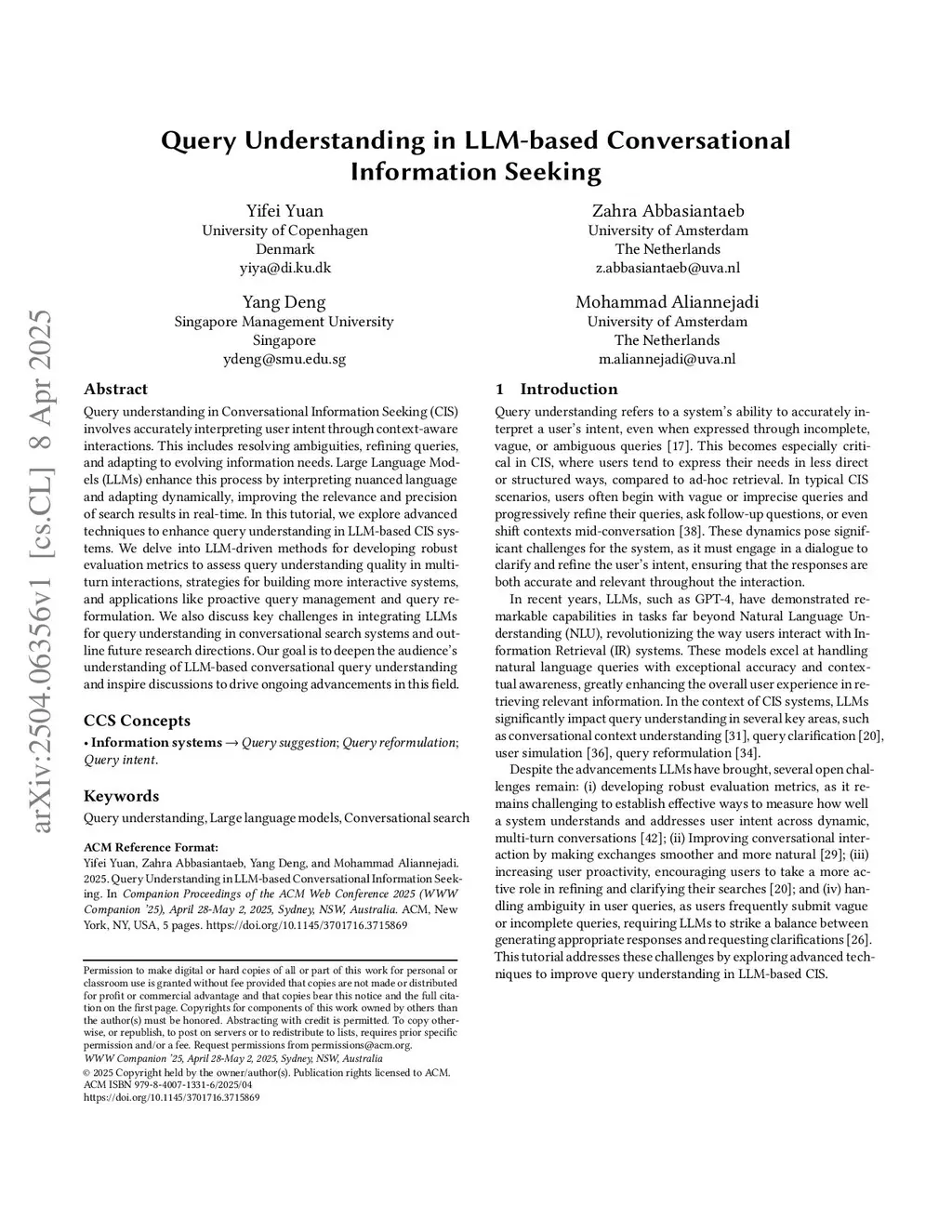 Query understanding in Conversational Information Seeking (CIS) involves accurately interpreting user intent through context-aware interactions. This includes resolving ambiguities, refining queries, and adapting to evolving information needs. Large Language Models (LLMs) enhance this process by interpreting nuanced language and adapting dynamically, improving the relevance and precision of search results in real-time. In this tutorial, we explore advanced techniques to enhance query understanding in LLM-based CIS systems. We delve into LLM-driven methods for developing robust evaluation metrics to assess query understanding quality in multi-turn interactions, strategies for building more interactive systems, and applications like proactive query management and query reformulation. We also discuss key challenges in integrating LLMs for query understanding in conversational search systems and outline future research directions. Our goal is to deepen the audience's understanding of LLM-based conversational query understanding and inspire discussions to drive ongoing advancements in this field.