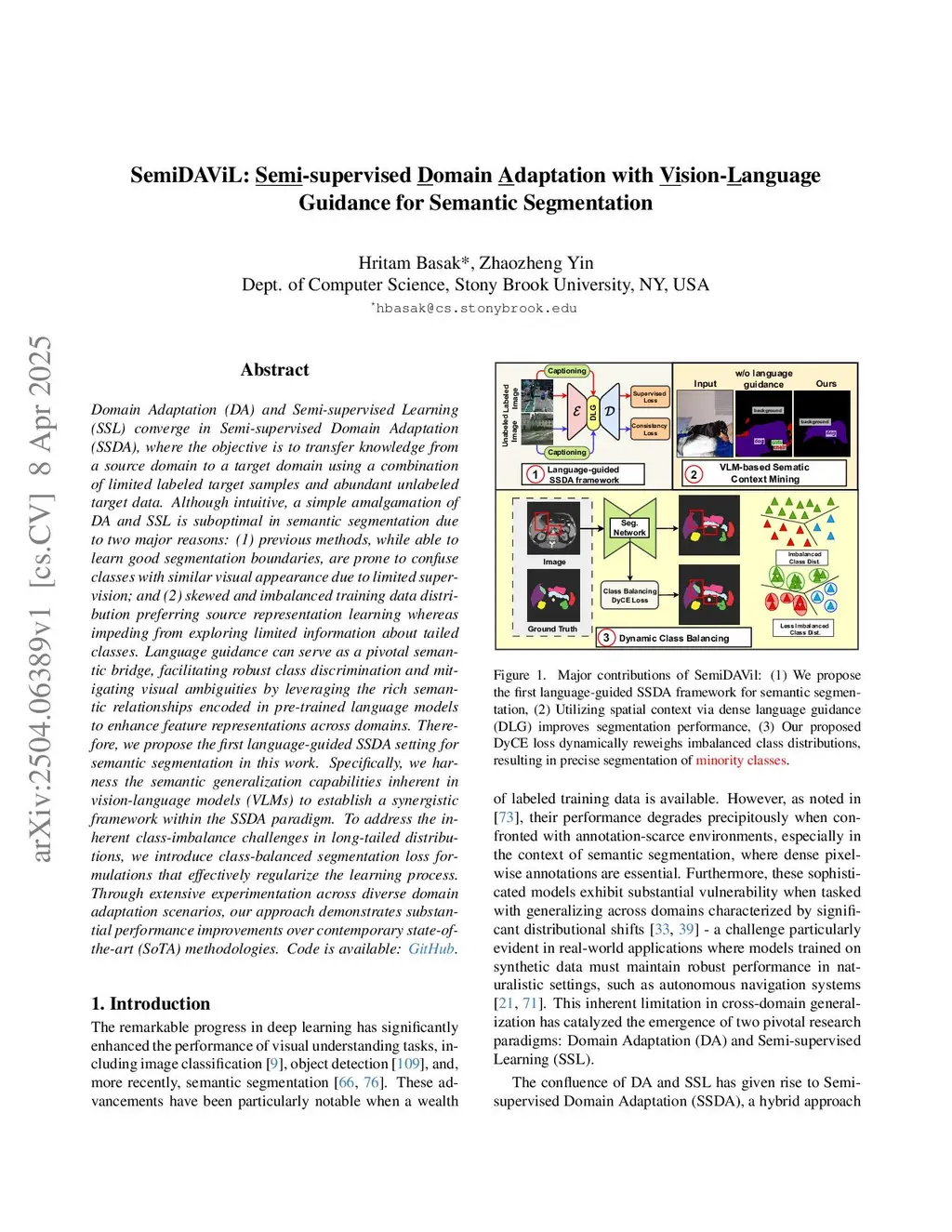 Domain Adaptation (DA) and Semi-supervised Learning (SSL) converge in Semi-supervised Domain Adaptation (SSDA), where the objective is to transfer knowledge from a source domain to a target domain using a combination of limited labeled target samples and abundant unlabeled target data. Although intuitive, a simple amalgamation of DA and SSL is suboptimal in semantic segmentation due to two major reasons: (1) previous methods, while able to learn good segmentation boundaries, are prone to confuse classes with similar visual appearance due to limited supervision; and (2) skewed and imbalanced training data distribution preferring source representation learning whereas impeding from exploring limited information about tailed classes. Language guidance can serve as a pivotal semantic bridge, facilitating robust class discrimination and mitigating visual ambiguities by leveraging the rich semantic relationships encoded in pre-trained language models to enhance feature representations across domains. Therefore, we propose the first language-guided SSDA setting for semantic segmentation in this work. Specifically, we harness the semantic generalization capabilities inherent in vision-language models (VLMs) to establish a synergistic framework within the SSDA paradigm. To address the inherent class-imbalance challenges in long-tailed distributions, we introduce class-balanced segmentation loss formulations that effectively regularize the learning process. Through extensive experimentation across diverse domain adaptation scenarios, our approach demonstrates substantial performance improvements over contemporary state-of-the-art (SoTA) methodologies. Code is available: \href{this https URL}{GitHub}.