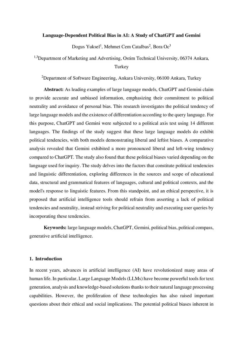 As leading examples of large language models, ChatGPT and Gemini claim to provide accurate and unbiased information, emphasizing their commitment to political neutrality and avoidance of personal bias. This research investigates the political tendency of large language models and the existence of differentiation according to the query language. For this purpose, ChatGPT and Gemini were subjected to a political axis test using 14 different languages. The findings of the study suggest that these large language models do exhibit political tendencies, with both models demonstrating liberal and leftist biases. A comparative analysis revealed that Gemini exhibited a more pronounced liberal and left-wing tendency compared to ChatGPT. The study also found that these political biases varied depending on the language used for inquiry. The study delves into the factors that constitute political tendencies and linguistic differentiation, exploring differences in the sources and scope of educational data, structural and grammatical features of languages, cultural and political contexts, and the model's response to linguistic features. From this standpoint, and an ethical perspective, it is proposed that artificial intelligence tools should refrain from asserting a lack of political tendencies and neutrality, instead striving for political neutrality and executing user queries by incorporating these tendencies.