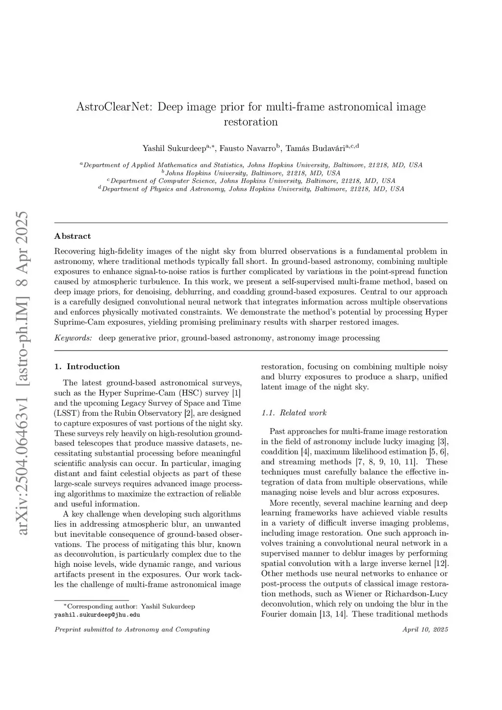 Recovering high-fidelity images of the night sky from blurred observations is a fundamental problem in astronomy, where traditional methods typically fall short. In ground-based astronomy, combining multiple exposures to enhance signal-to-noise ratios is further complicated by variations in the point-spread function caused by atmospheric turbulence. In this work, we present a self-supervised multi-frame method, based on deep image priors, for denoising, deblurring, and coadding ground-based exposures. Central to our approach is a carefully designed convolutional neural network that integrates information across multiple observations and enforces physically motivated constraints. We demonstrate the method's potential by processing Hyper Suprime-Cam exposures, yielding promising preliminary results with sharper restored images.