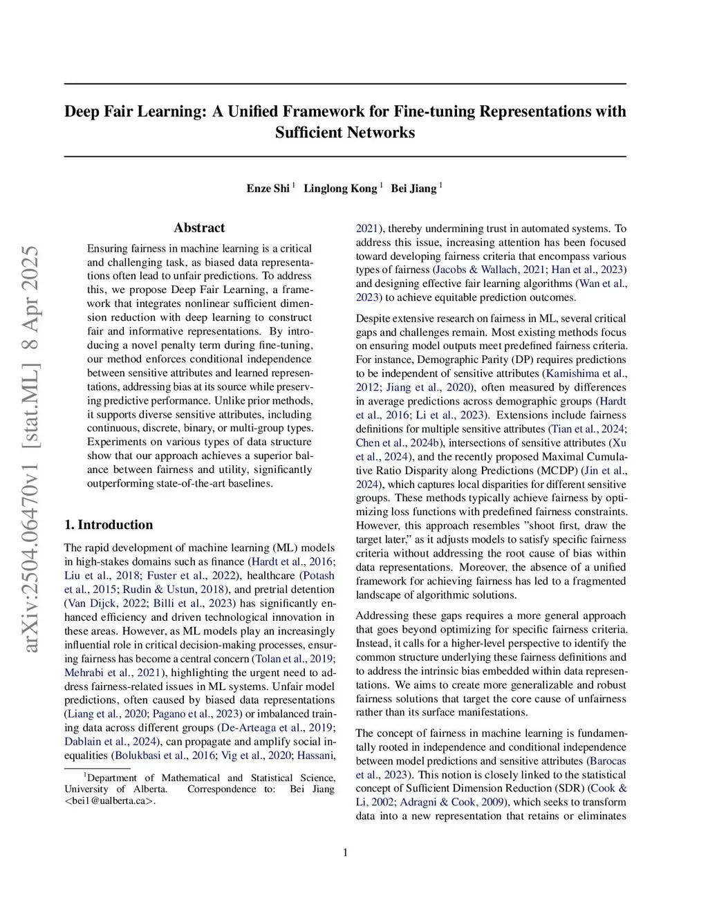 Ensuring fairness in machine learning is a critical and challenging task, as biased data representations often lead to unfair predictions. To address this, we propose Deep Fair Learning, a framework that integrates nonlinear sufficient dimension reduction with deep learning to construct fair and informative representations. By introducing a novel penalty term during fine-tuning, our method enforces conditional independence between sensitive attributes and learned representations, addressing bias at its source while preserving predictive performance. Unlike prior methods, it supports diverse sensitive attributes, including continuous, discrete, binary, or multi-group types. Experiments on various types of data structure show that our approach achieves a superior balance between fairness and utility, significantly outperforming state-of-the-art baselines.