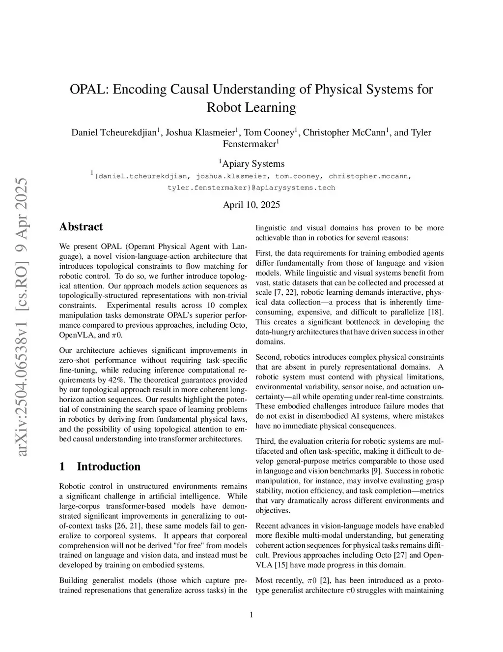We present OPAL (Operant Physical Agent with Language), a novel vision-language-action architecture that introduces topological constraints to flow matching for robotic control. To do so, we further introduce topological attention. Our approach models action sequences as topologically-structured representations with non-trivial constraints. Experimental results across 10 complex manipulation tasks demonstrate OPAL's superior performance compared to previous approaches, including Octo, OpenVLA, and 0.Our architecture achieves significant improvements in zero-shot performance without requiring task-specific fine-tuning, while reducing inference computational requirements by 42%. The theoretical guarantees provided by our topological approach result in more coherent long-horizon action sequences. Our results highlight the potential of constraining the search space of learning problems in robotics by deriving from fundamental physical laws, and the possibility of using topological attention to embed causal understanding into transformer architectures.