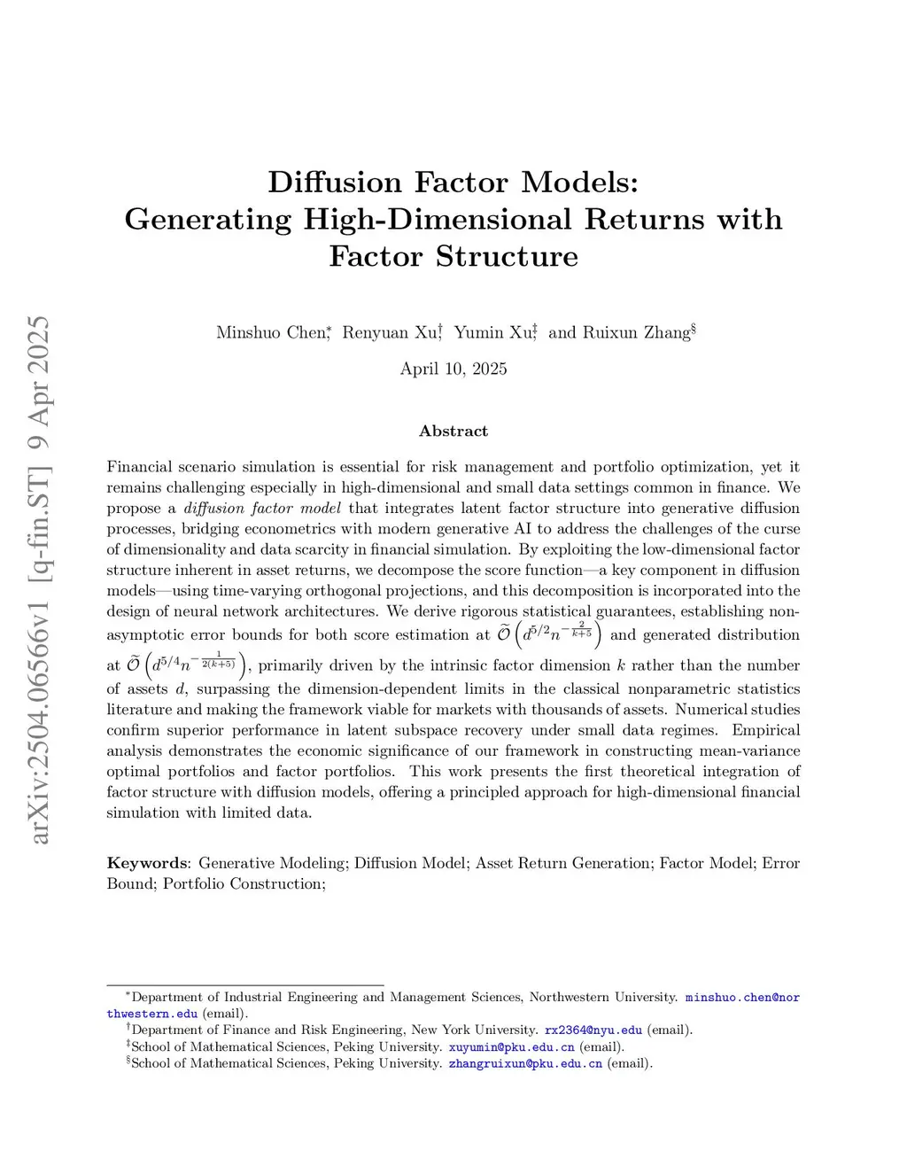 Financial scenario simulation is essential for risk management and portfolio optimization, yet it remains challenging especially in high-dimensional and small data settings common in finance. We propose a diffusion factor model that integrates latent factor structure into generative diffusion processes, bridging econometrics with modern generative AI to address the challenges of the curse of dimensionality and data scarcity in financial simulation. By exploiting the low-dimensional factor structure inherent in asset returns, we decompose the score function--a key component in diffusion models--using time-varying orthogonal projections, and this decomposition is incorporated into the design of neural network architectures. We derive rigorous statistical guarantees, establishing nonasymptotic error bounds for both score estimation at O(d^{5/2} n^{-2/(k+5)}) and generated distribution at O(d^{5/4} n^{-1/2(k+5)}), primarily driven by the intrinsic factor dimension k rather than the number of assets d, surpassing the dimension-dependent limits in the classical nonparametric statistics literature and making the framework viable for markets with thousands of assets. Numerical studies confirm superior performance in latent subspace recovery under small data regimes. Empirical analysis demonstrates the economic significance of our framework in constructing mean-variance optimal portfolios and factor portfolios. This work presents the first theoretical integration of factor structure with diffusion models, offering a principled approach for high-dimensional financial simulation with limited data. Our code is available atthis https URL.